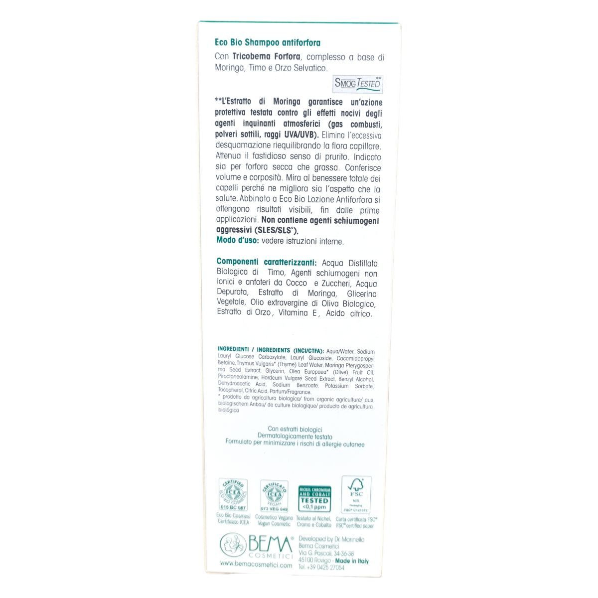 A BEMA BIO Hair Shampoo antiforfora egy biokozmetikum, amely komplex hatóanyag-kombinációval rendelkezik, amely Moringából, kakukkfűből és egérárpából áll. A terméket antropogén légszennyező anyagok, mint például égéstermékek, finom részecskék és UVA/UVB sugárzás ellen tesztelték, biztosítva védőhatását. Megszünteti a túlzott hámlást, helyreállítja a fejbőr flóráját és enyhíti a viszkető érzést, így száraz és zsíros korpa esetén egyaránt alkalmazható. Használata javítja a haj szerkezetét és volumenét, elősegítve a haj egészségének és megjelenésének fenntartását. A termék SLS/SLES mentes, nem tartalmaz parabéneket, szintetikus színezékeket, valamint minimalizálja a bőrallergiák kockázatát. A sampon használata mellett a Dandruff Bio Lotionnal együtt alkalmazva már az első használattól látható és klinikailag igazolt eredményeket nyújt. A termék bio ökológiai minősítéssel, vegán tanúsítvánnyal és nikkelezést, krómot és kobaltot tesztelt formulával rendelkezik, megfelelve a legmagasabb minőségi elvárásoknak, miközben környezetbarát FSC papír csomagolásban érhető el. Kiváló választás azok számára, akik természetes, hatékony megoldást keresnek korpás fejbőr ápolására az atmoszférikus szennyeződések által okozott káros hatások ellen.
