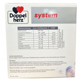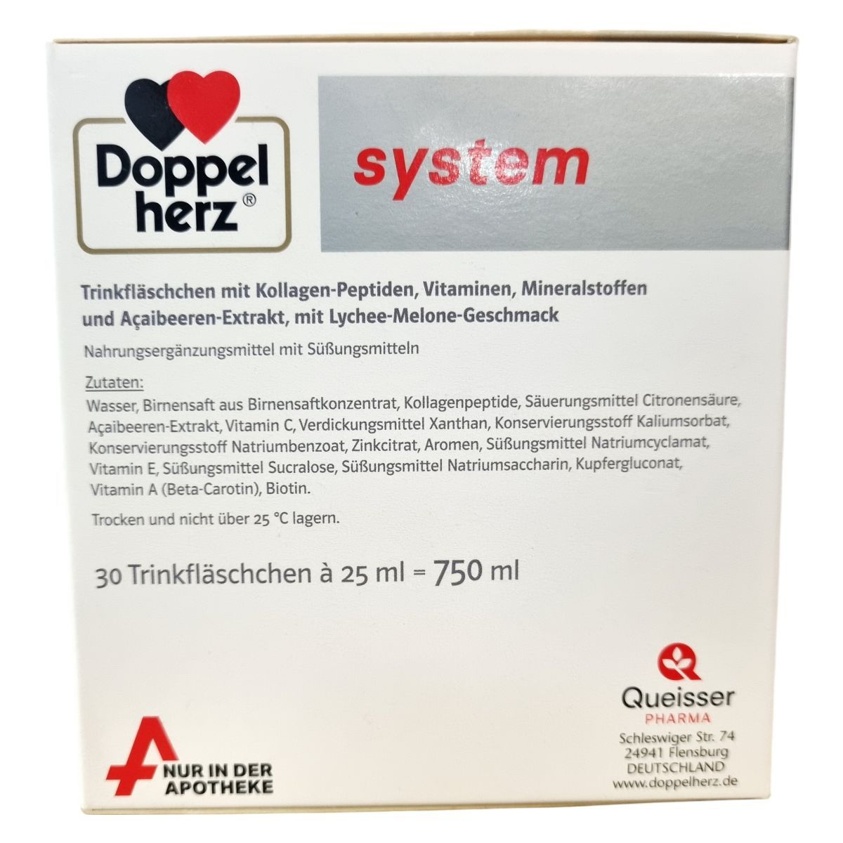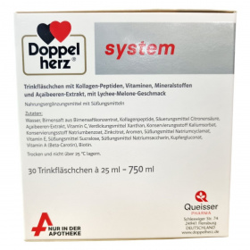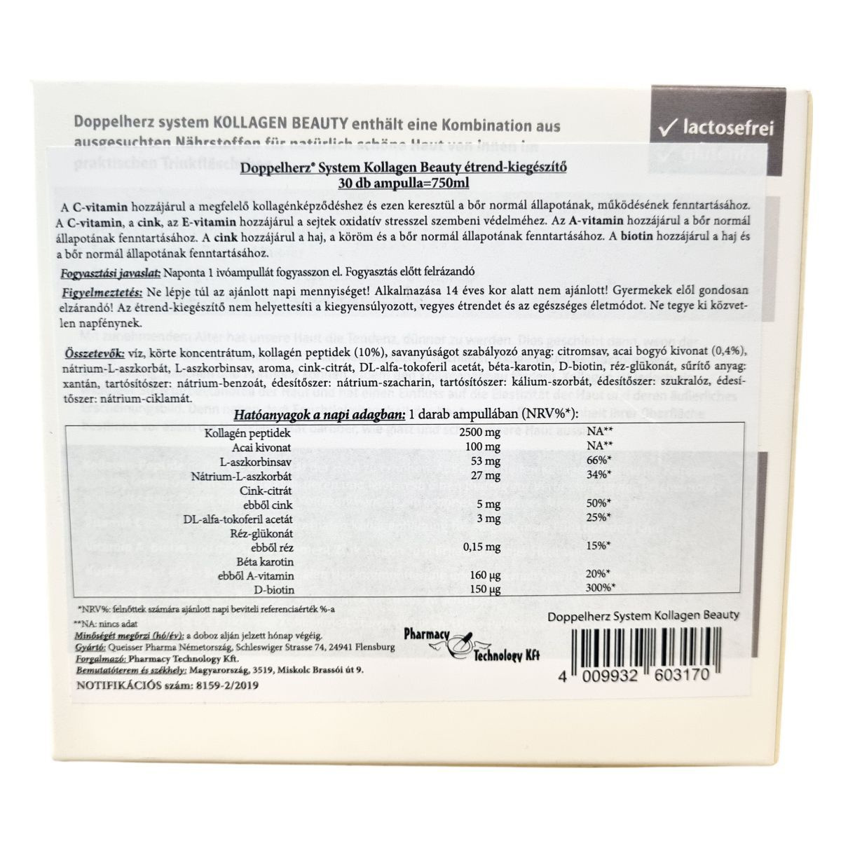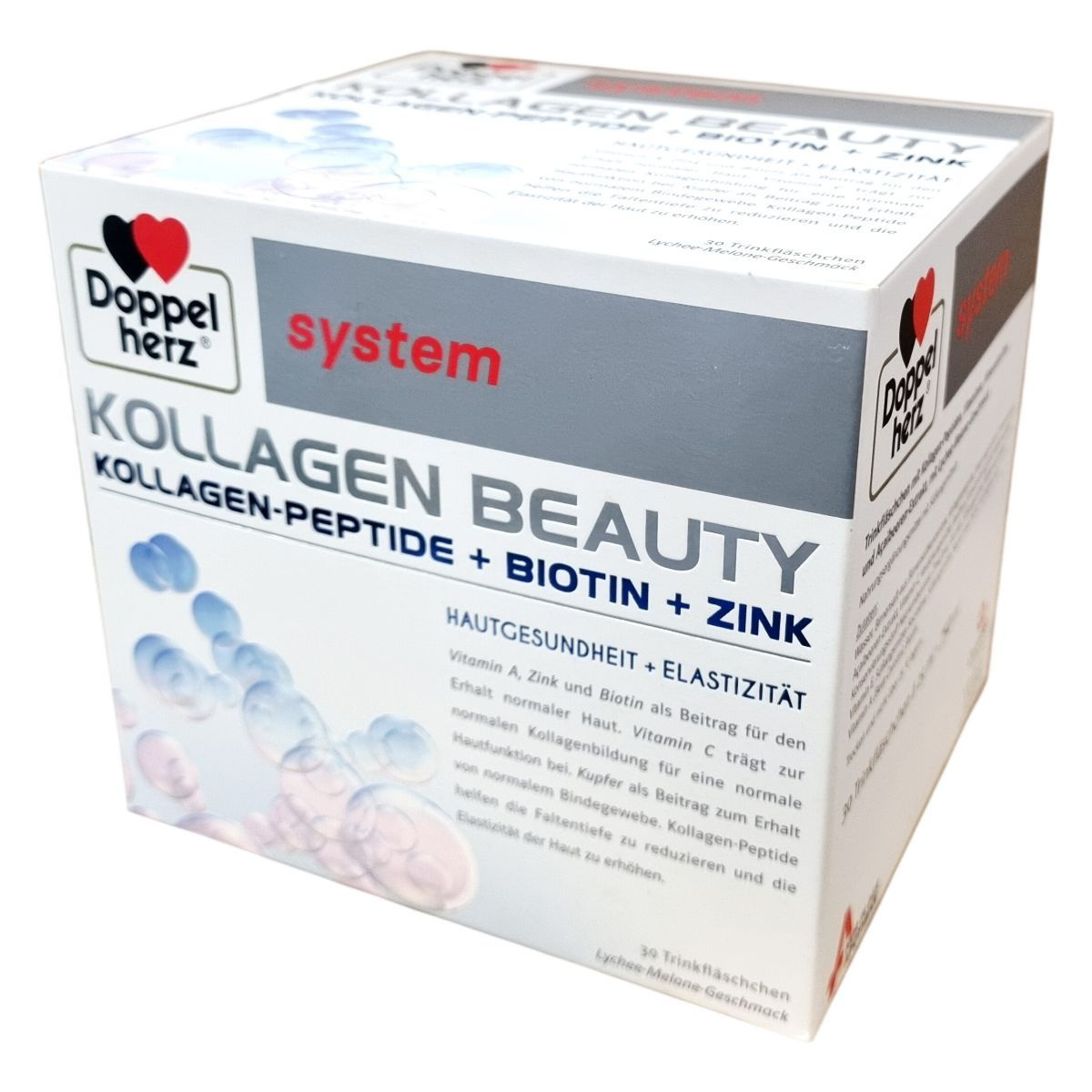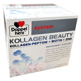 A Doppelherz® system Kollagen Beauty ivóampullái kollagén-peptideket, vitaminokat, ásványi anyagokat és açaibogyó-kivonatot tartalmaznak, melyek lychee-melone ízesítésűek. A C-vitamin hozzájárulhat a normál kollagénképződéshez és így a bőr normál működéséhez, továbbá a C-vitamin, cink és E-vitamin segítheti a sejtek oxidatív stresszel szembeni védelmét. Az A-vitamin, cink és biotin fontos lehet a bőr, haj és köröm egészségének fenntartásában. A kollagén-peptidek hozzájárulhatnak a bőr rugalmasságának növeléséhez és a ráncok mélységének csökkentéséhez. Az ampullák vízből, körte koncentrátumból, citromsavból, xantánból, valamint többféle tartósító- és édesítőszerből készülnek. A termék alkalmazása 14 év alatti gyermekek számára nem ajánlott, és nem helyettesíti a kiegyensúlyozott étrendet és az egészséges életmódot.