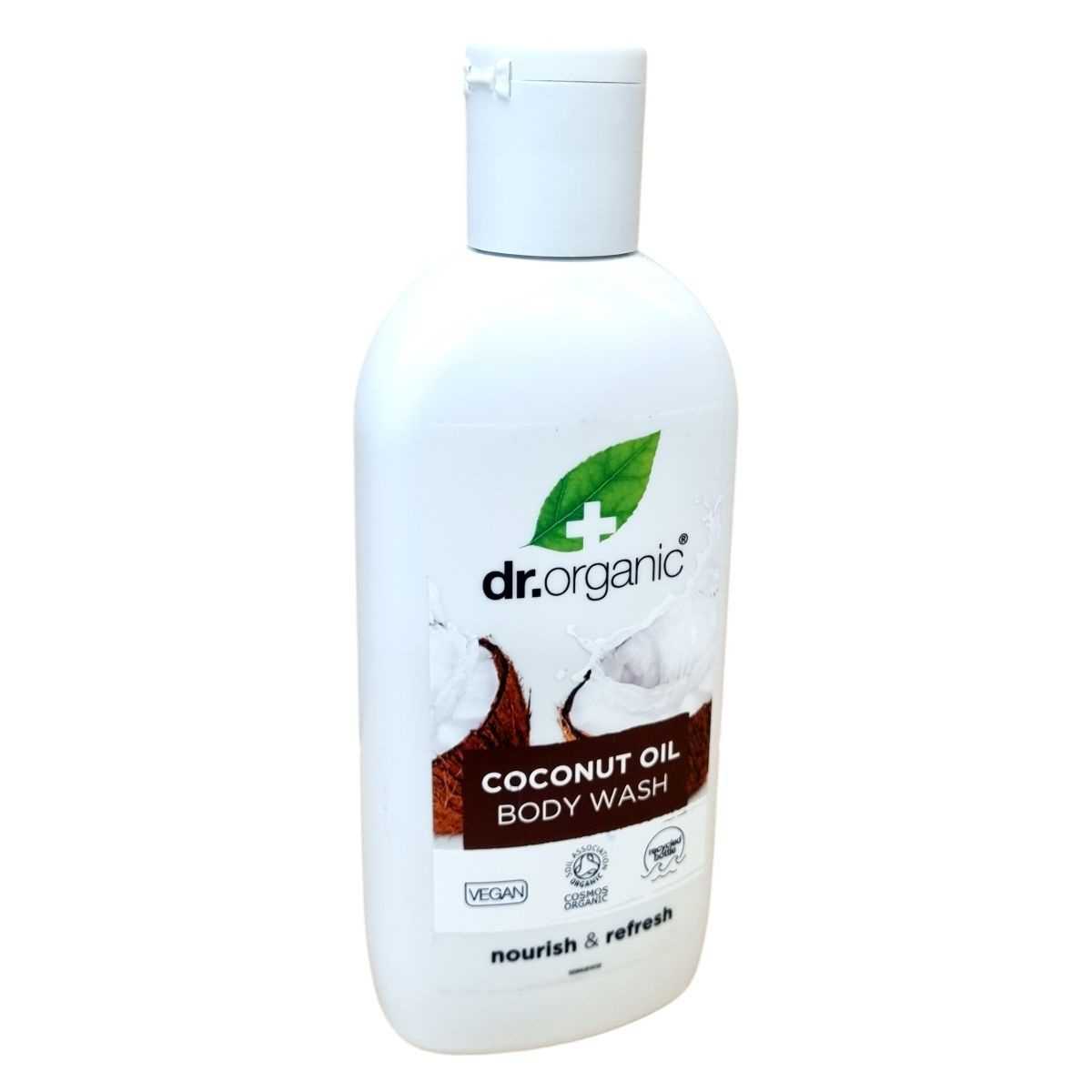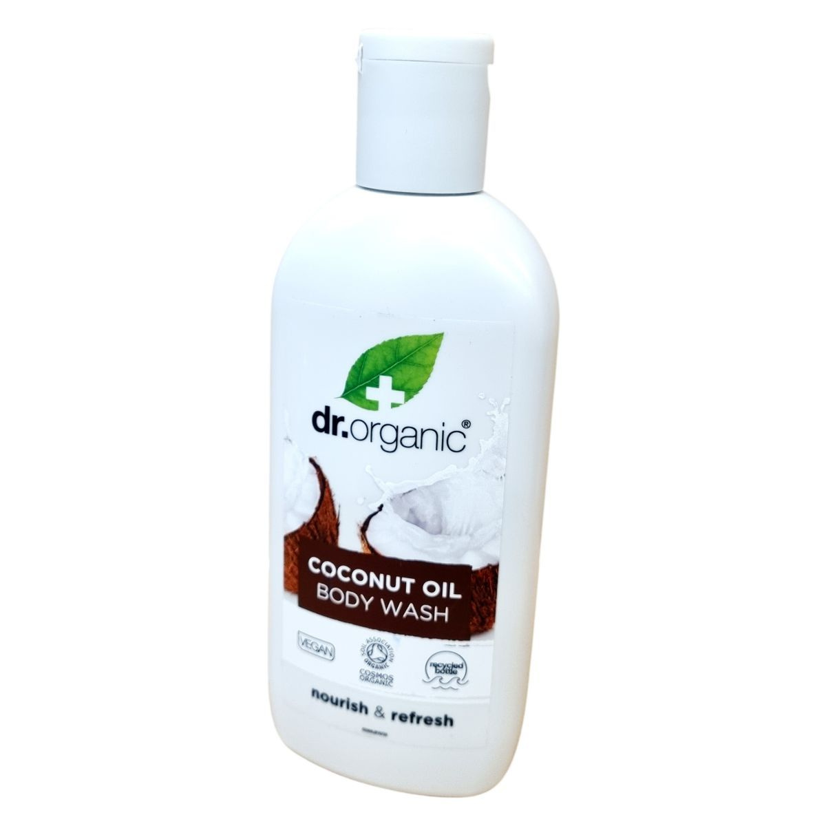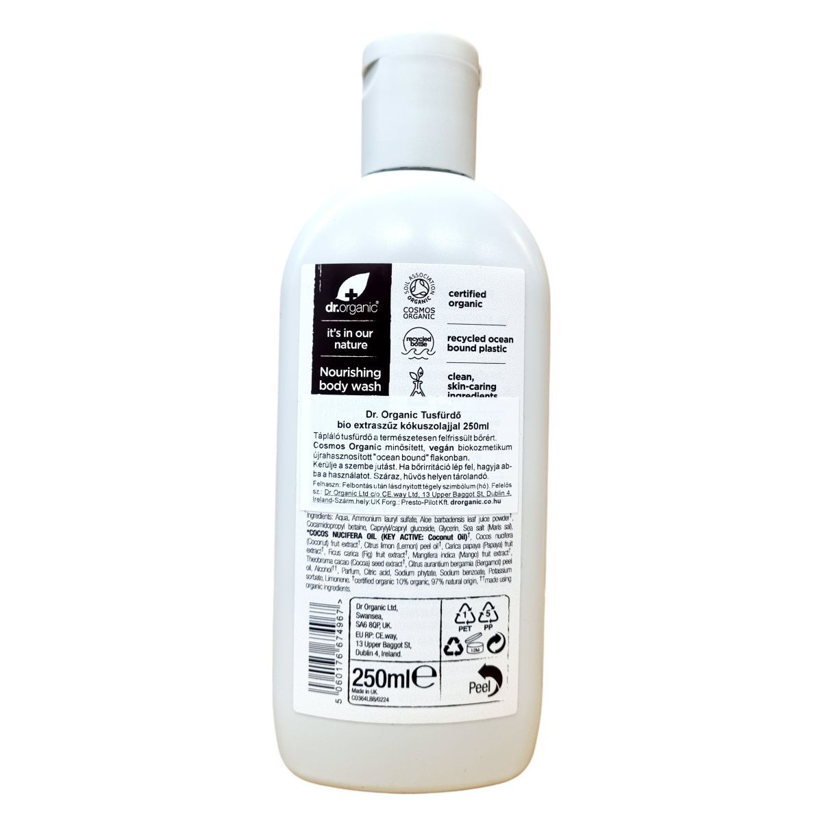 A Dr. Organic bio extraszűz kókuszolajjal készült tusfürdője egy minősített, vegán biokozmetikum, amely újrahasznosított "ocean bound" műanyag flakonban érkezik. A tiszta, bőrt ápoló összetevők között számos organikus kivonat található, mint például aloe vera por, különféle gyümölcskivonatok és illóolajok, amelyek táplálják és felfrissítik a bőrt. A termék összetevői 10% organikus, 97% természetes eredetű anyagokból állnak, hozzájárulva a fenntartható és környezettudatos használathoz.
