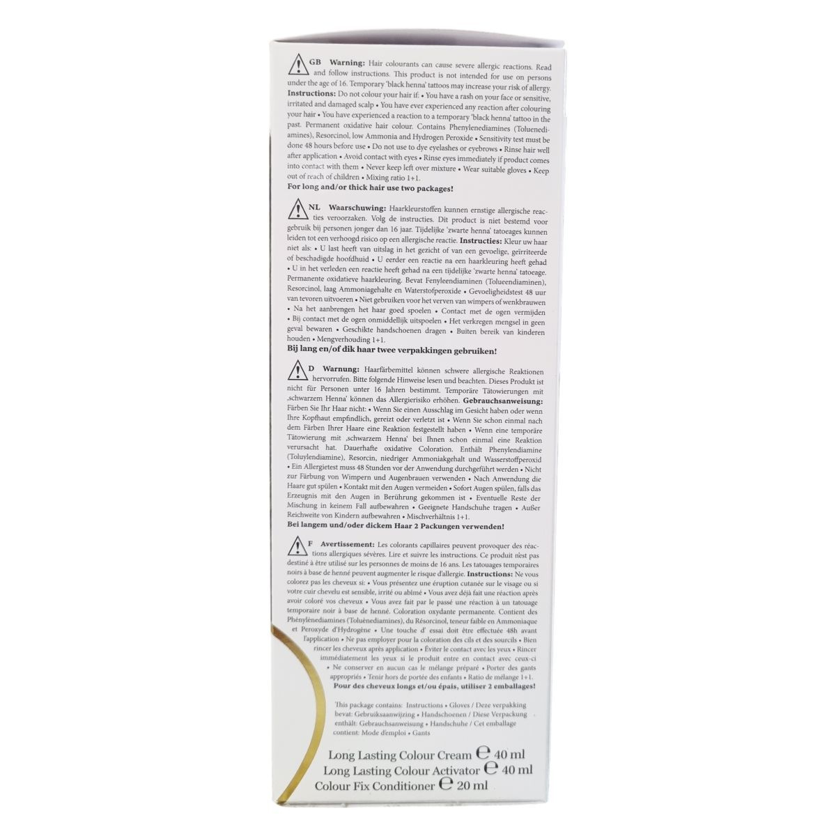 Ne használd a terméket, ha az arcon kiütés, érzékeny vagy irritált fejbőr jelentkezik. Használat előtt 48 órával érzékenységi próba szükséges. Ne alkalmazd szempilla vagy szemöldök festésére. A szemmel való érintkezést kerülni kell, érintkezés esetén azonnal öblítsd ki. A hajfestés után a hajat alaposan ki kell öblíteni. A keveréket nem szabad eltenni későbbi használatra. Viselj védőkesztyűt. A keverési arány 1+1. Hosszú vagy vastag szálú haj esetén két csomag használata javasolt.