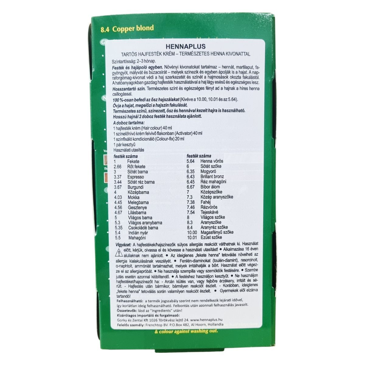 A Henna Plus tartós hajfesték krém természetes növényi kivonatokat tartalmaz, amelyek egyszerre festik és ápolják a hajat. A benne lévő henna, martilapu, fa-gyöngy, mályva és búzacsíra kivonatok valamint a napraforgomag-kivonat védi a haj szerkezetét és színét a fakulástól. A hajfesték használatával hosszú ideig tartó, természetes árnyalatú és egészséges fényű haj érhető el, amely befedi a ősz hajszálakat az ajánlott színek kivételével. A csomag tartalma: 40 ml hajfesték krém, 40 ml színelőhívó a felvivő flakonban, 20 ml színfixáló kondicionáló, egy pár kesztyű és használati utasítás. Termék hosszú szőke és sötét szőke hajra, több árnyalatban, beleértve a réz, mahagóni és lilásbarna színeket is. Használatakor körültekintően járjon el a biztonsági előírások betartásával!