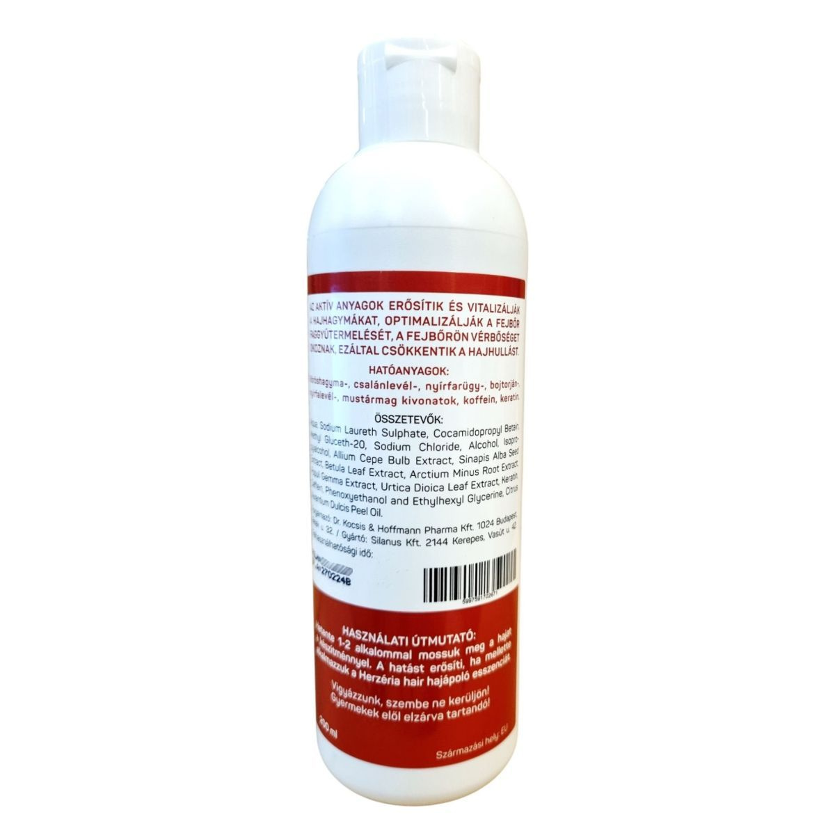 A HERZÉRIA gyógynövényes és koffeines sampon különleges összetevői, mint a vöröshagyma, csalánlevél, nyírfalevél, bojtorján, mustármag kivonatok, valamint a koffein és keratin, hozzájárulhatnak a hajhagymák erősítéséhez és vitalizálásához. Az aktív anyagok optimalizálhatják a fejbőr faggyútermelését, és vérbőséget okozva csökkenthetik a hajhullást. A termék 200 ml-es kiszerelésben kapható, és EU-ból származik. A használati útmutató szerint hetente 1-2 alkalommal ajánlott használni, és a hatás fokozása érdekében javasolt a Herzéria hair hajápoló esszencia együttes alkalmazása.