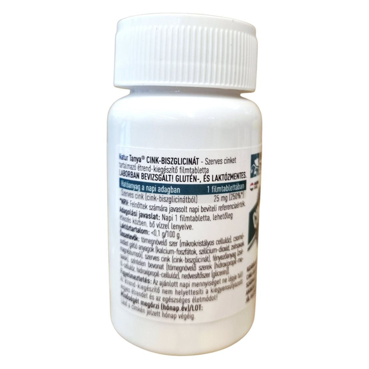 A Natur Tanya Cink-biszglicinát tabletta kizárólag 100%-ban cink-biszglicinátból származó, aminosav-kelát formájú szerves cinket tartalmaz, amely jobb biohasznosulással rendelkezik, mint a cink-glükonát. A szerves cink hozzájárulhat a normál szellemi működéshez, a látás és a bőr egészségének megőrzéséhez, valamint a normál tesztoszteronszint fenntartásához. Emellett fontos szerepet játszhat az immunrendszer normál működésében, a sejtosztódásban és az oxidatív stressz elleni védelemben. A termék titán-dioxid-mentes, vegán összetételű, laborban bevizsgált, glutén- és laktózmentes. Magyar gyártású, 100%-ban hazai fejlesztésű készítmény.