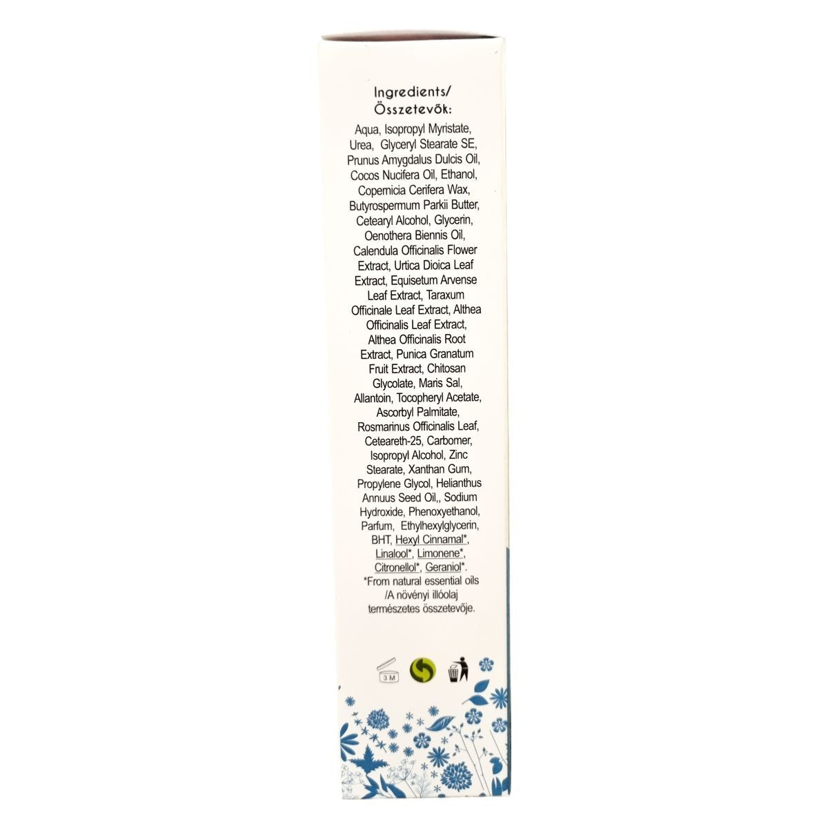 Urea, ligetszépe olaj, mandulaolaj, holt-tengeri só, E-vitamin, körömvirág kivonat, gránátalma kivonat, gyógynövények (csalán, zsurló, gyermekláncfű, fehérmályva)