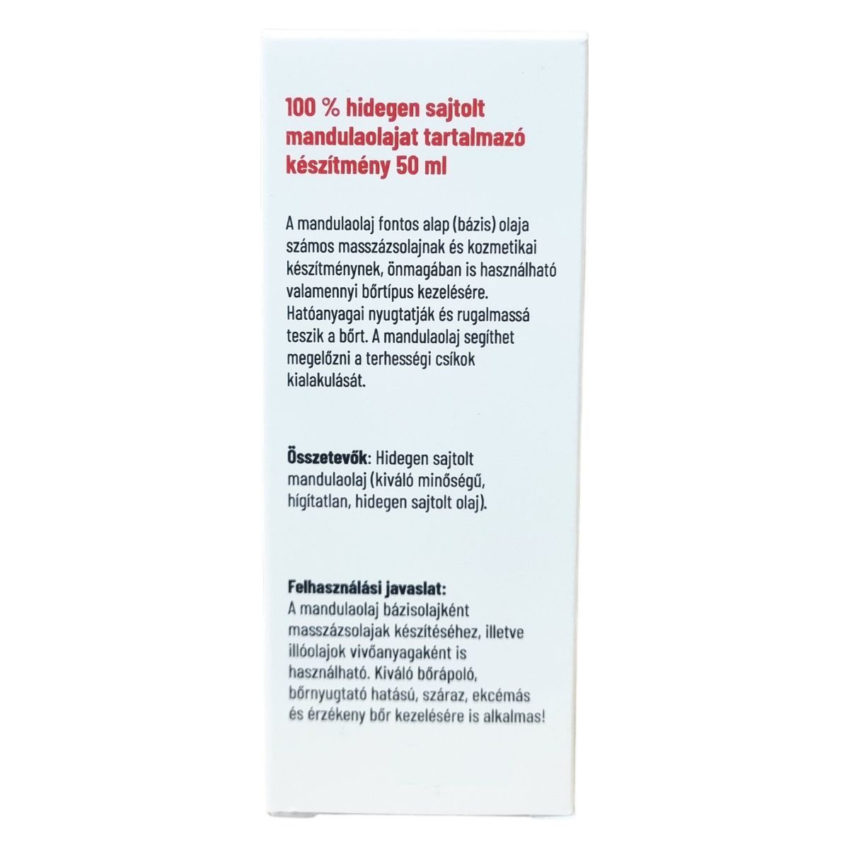 Kiszerelés: 50 ml/üveg. Tárolás: Szobahőmérsékleten, gyermekek elől elzárva! Összetevők: hidegen sajtolt mandulaolaj (Kiváló minőségű, higítatlan, hidegen sajtolt olaj)