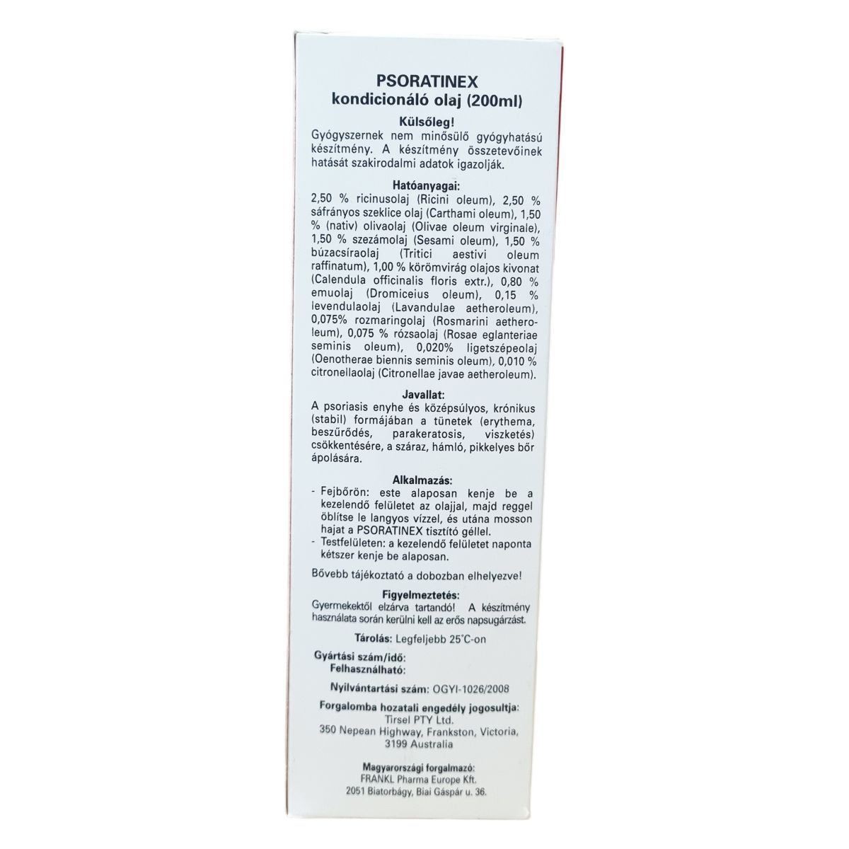 A Psoratinex kondicionáló olaj egy külsőleg használatos, gyógyhatású készítmény, amely enyhe és középsúlyos, stabil psoriasis tüneteinek enyhítésére szolgál. Hatóanyagai többféle növényi olaj és kivonat, amelyeknek bőrnyugtató és ápoló hatását szakirodalmi adatok igazolják. Használata egyszerű: fejbőrre este kenve, reggel leöblítve, majd speciális tisztító gélt alkalmazva, a testfelületen naponta kétszer történő bedörzsöléssel javasolt. A készítményt gyermekek elől elzárva kell tartani, és a használat alatt az erős napsugárzást kerülni kell.