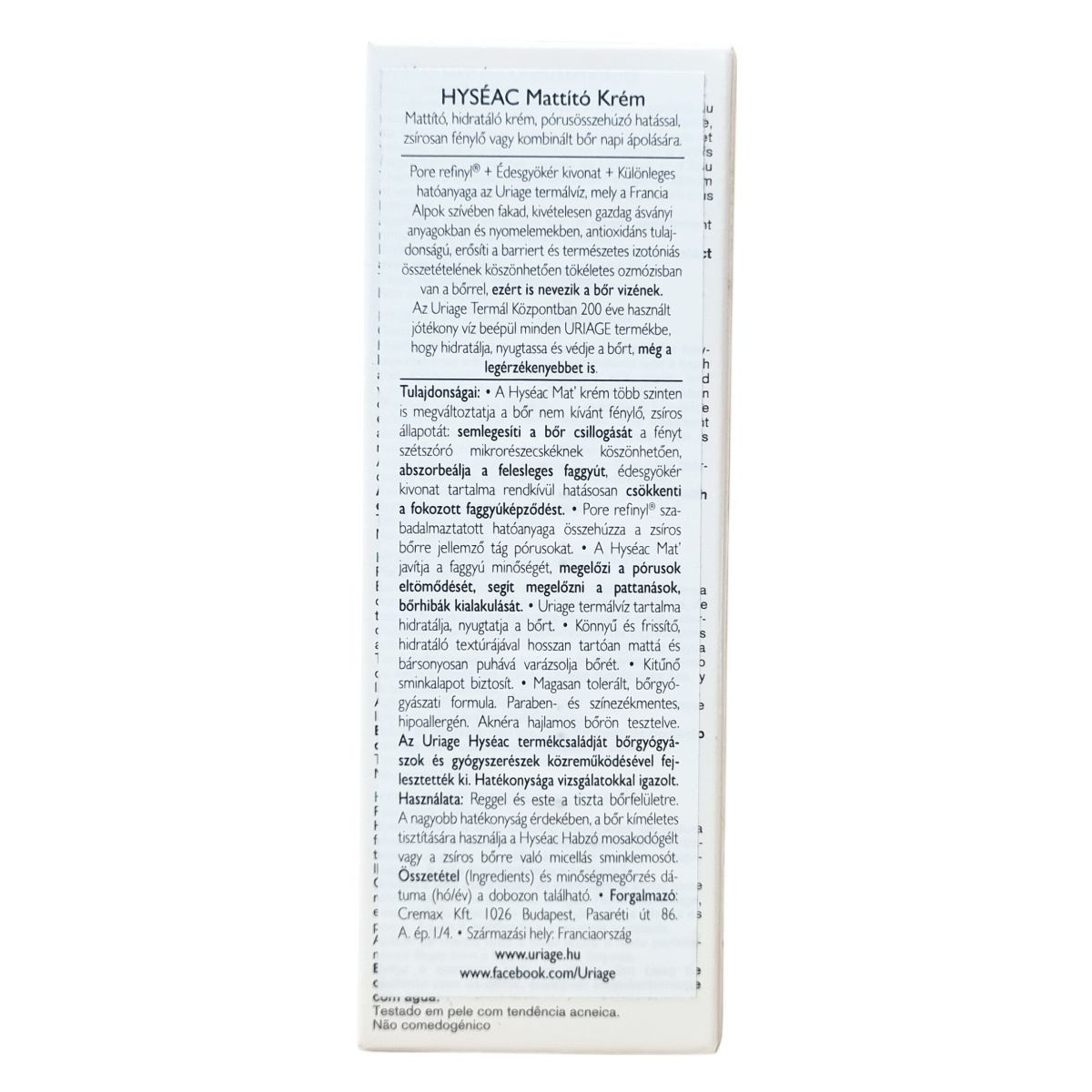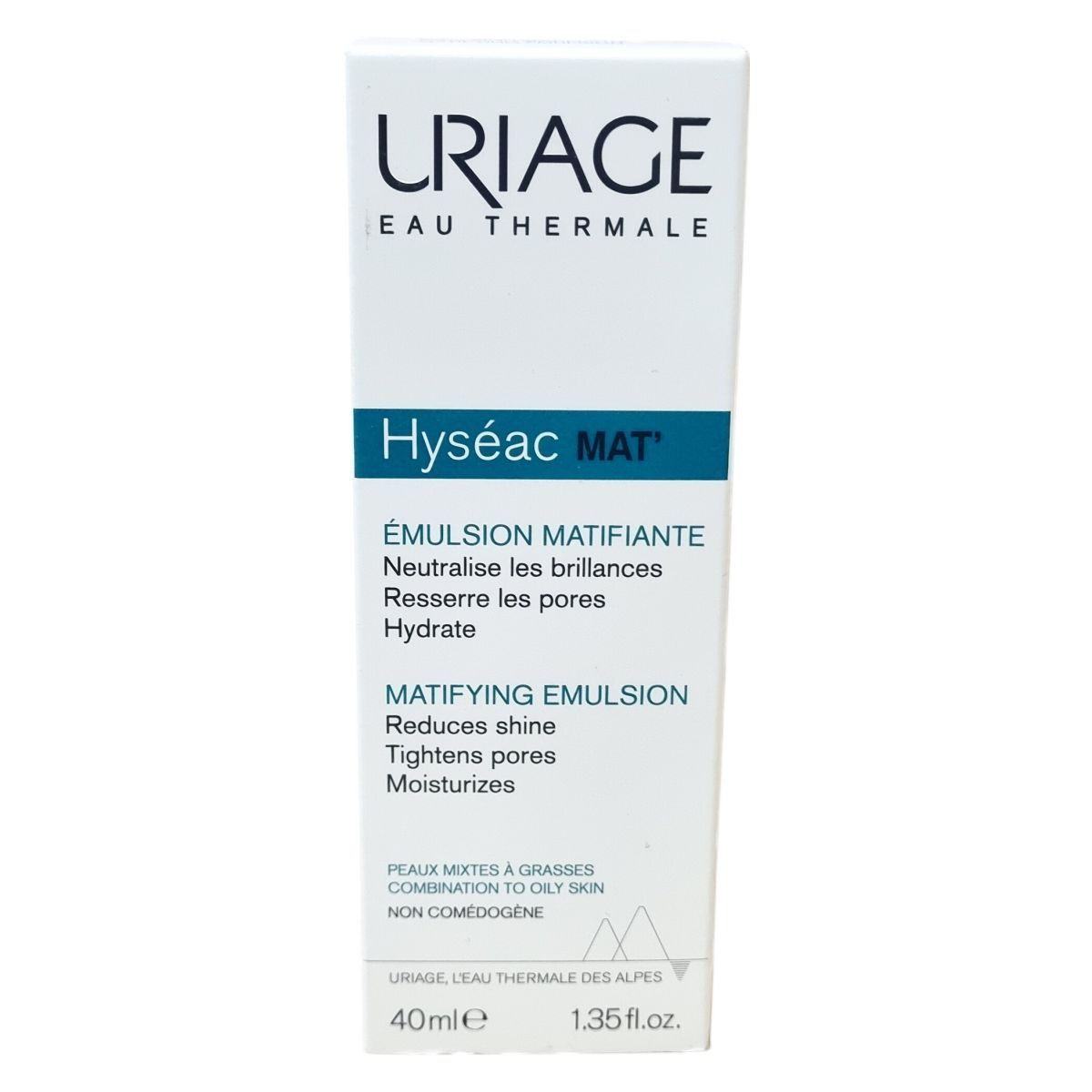 Az Uriage Hyséac MAT' emulzió egy mattító, hidratáló krém, amely specifikusan a kombinált és zsíros bőr napi ápolására lett kifejlesztve. Hatékonyan semlegesíti a felesleges faggyút és csökkenti a bőr csillogását mikrorészecskék segítségével, amelyek fényt szórnak. A zsírtermelést az édesgyökér kivonat szabályozza, míg a Pore refinyl® szabadalmaztatott összetevő segít összehúzni a kitágult pórusokat, javítva a faggyú minőségét és megelőzve a pórusok eltömődését, ezáltal csökkentve a pattanások és bőrhibák kialakulását. Az Uriage termálvíz, amely gazdag ásványi anyagokban és nyomelemekben, antioxidáns tulajdonságokkal bír, erősíti a bőr természetes védőrétegét, hidratálja és nyugtatja még a legérzékenyebb bőrt is. Könnyű, frissítő és hosszan tartó hidratáló textúrájával bársonyosan matt megjelenést biztosít és kiváló sminkalapként szolgál. A termék bőrgyógyászati teszteken alapul, aknéra hajlamos bőrön is kipróbált, paraben- és színezékmentes, hipoallergén formula. Az Uriage termálvíz a Francia Alpok természetes forrásából származik, ahol több mint 200 éve használják jótékony hatásai miatt, és az Uriage laboratóriumaival közösen fejlesztették ki ezt a bőrápolót, hogy megőrizze és védje a bőr egészségét minden nap.