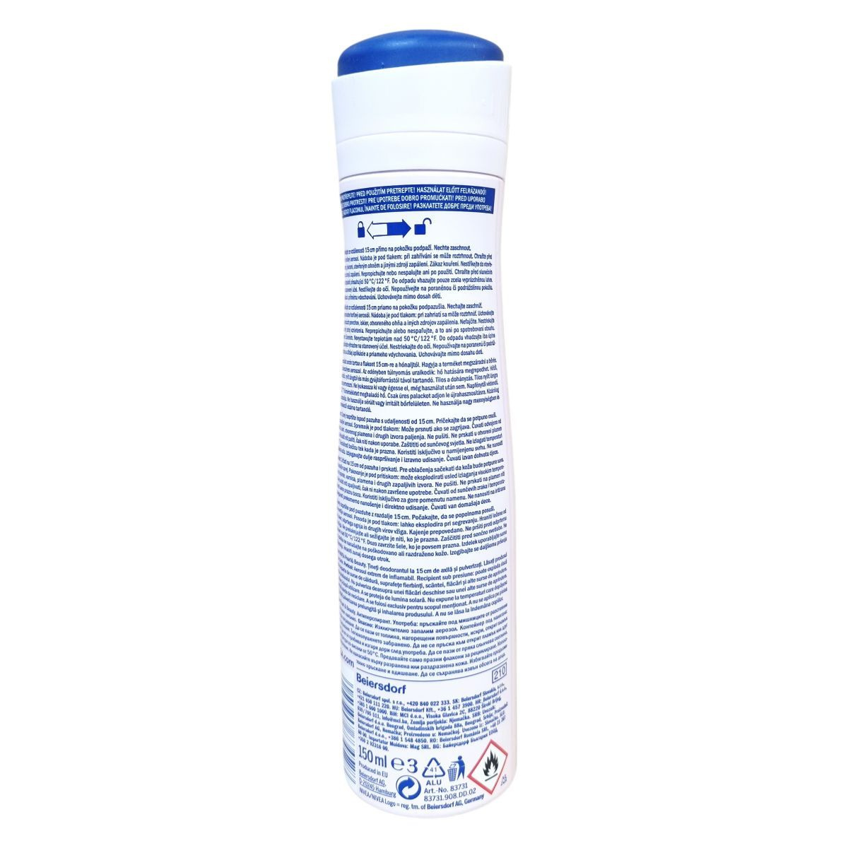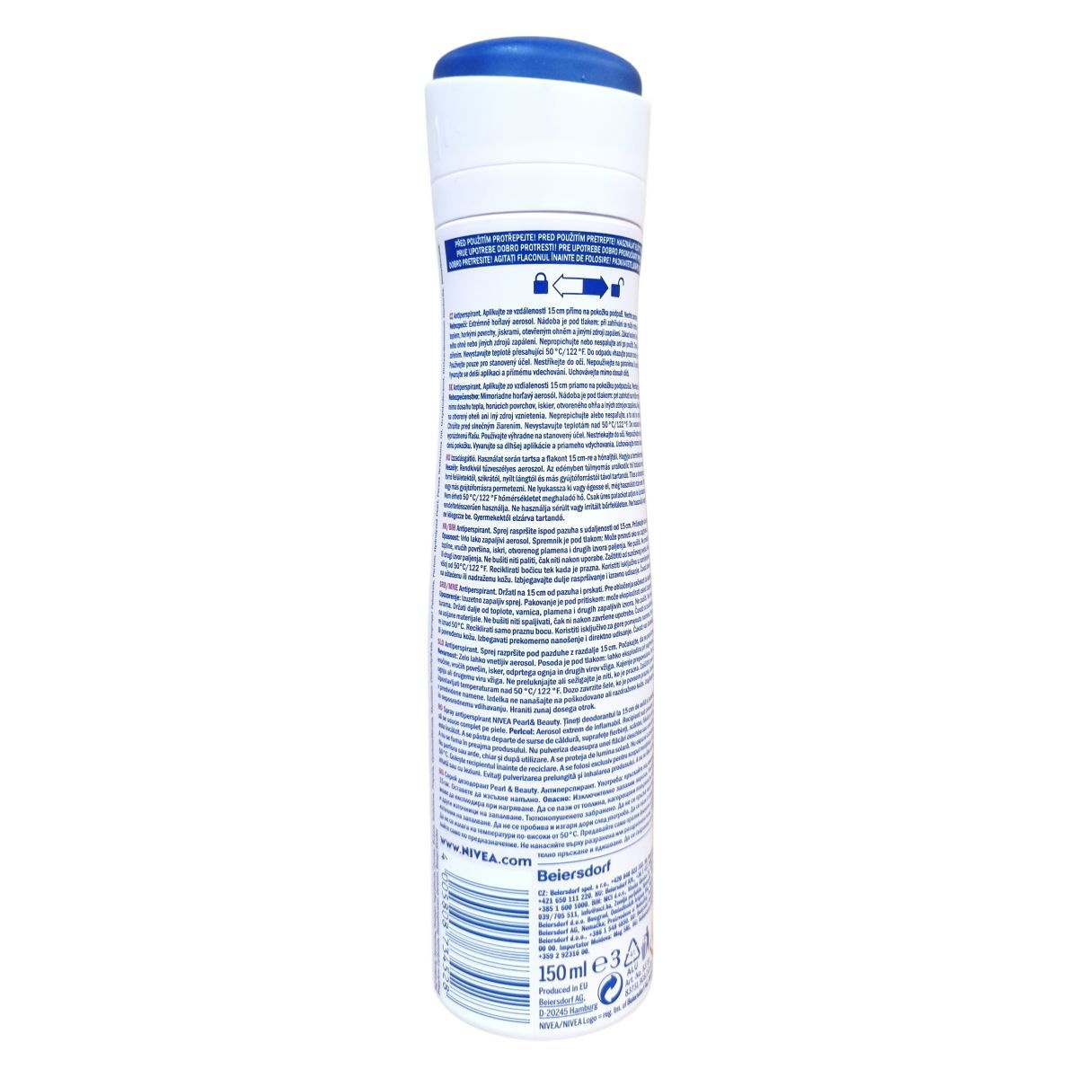 A NIVEA Anti-Perspirant Pearl & Beauty gyorsan száradó aeroszolos izzadásgátló spray 150 ml-es kiszerelésben elérhető. A terméket úgy kell használni, hogy a flakont 15 cm-re tartva közvetlenül a bőrre permetezzük, majd hagyjuk megszáradni. Használat előtt fel kell rázni. A termék 48 órás védelmet biztosít a kellemetlen izzadás ellen, miközben sima és esztétikus hónaljat eredményez. A készítmény rendkívül tűzveszélyes és aeroszol formában van, így a palack túlnyomás alatt áll, ezért tárolása során fontos elkerülni a hőséget és a gyújtóforrásokat. Tilos nyílt lángra permetezni vagy a palackot kilyukasztani, illetve égetni. Használat során kerülni kell a termék szembe kerülését, valamint sérült vagy irritált bőrfelületen történő alkalmazását. A túlzott és hosszan tartó belélegzést szintén kerülni kell. A palackot gyermekek elől elzárva kell tartani. A termék EU-ban készült, és a csomagoláson feltüntették a NIVEA márkajelzést és a Beiersdorf AG nevét, a gyártó céget.