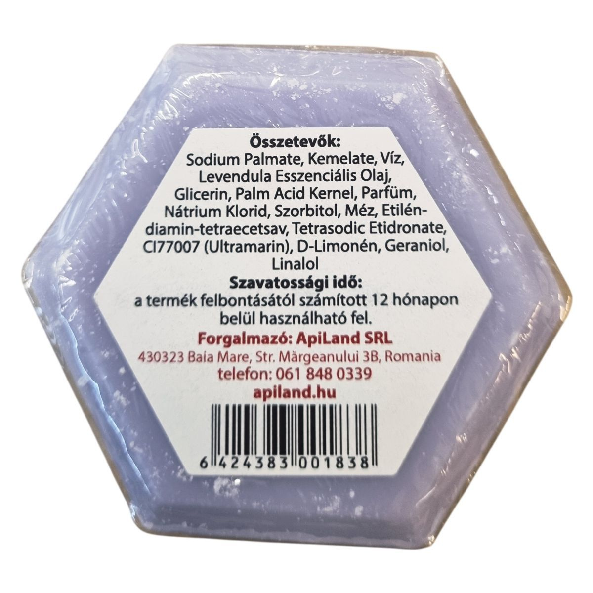 A termék levendula illatú mézes szappan, amely hatszög alakú formában érkezik. A címkén feltüntetett információk szerint a szappan természetes összetevőket, köztük mézet és levendula esszenciális olajat tartalmaz. A gyártói közlés alapján a szappan 12 hónapon belül használható fel a felbontást követően. A címkén szerepelnek az illatanyagok, köztük a D-Limonén, a Geraniol és a Linalol. A terméket az ApiLand SRL forgalmazza.