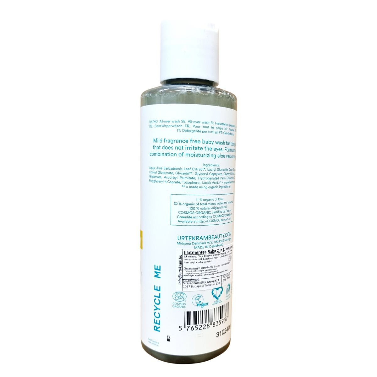 Az Urtekram Sensitive Care All-over Wash egy 100%-ban természetes eredetű, COSMOS Organic minősítéssel rendelkező babaápolási termék, amely bio összetevőket használ. Hidratáló aloe vera és glicerin kombinációja gondoskodik a baba bőrének gyengéd ápolásáról hajmosás és testfürdetés során. Illatanyagmentes, szemkímélő formula, amely nem vált ki allergiás reakciókat és a baba érzékeny bőréhez igazodik. A termék újrahasznosítható, és környezetbarát csomagolásban kerül forgalomba. Származási helye Dánia.