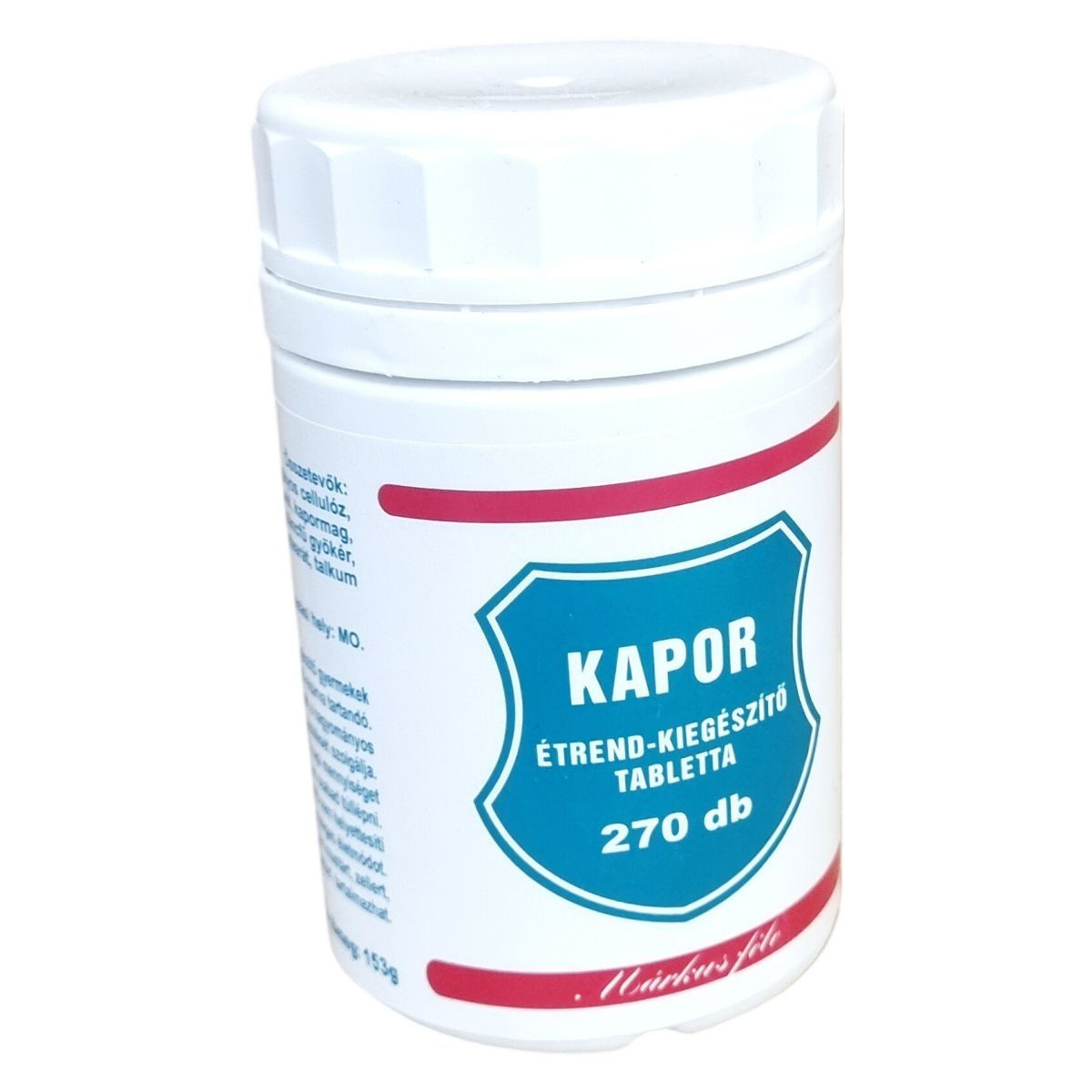 A Kapor étrend-kiegészítő tabletta 270 darabos kiszerelésben kapható, összetételében kaporlevél, kapormag és gyermekláncfű gyökér található meg, mikrokristályos cellulóz, magnézium-sztearát és talkum hordozóanyagok mellett. Magyarországon készült termék, amely támogatja a hagyományos étrend kiegészítését. Fontos betartani az ajánlott napi adagolást, és a terméket gyermekektől elzárva tartani. Nettó tömege 153 gramm.