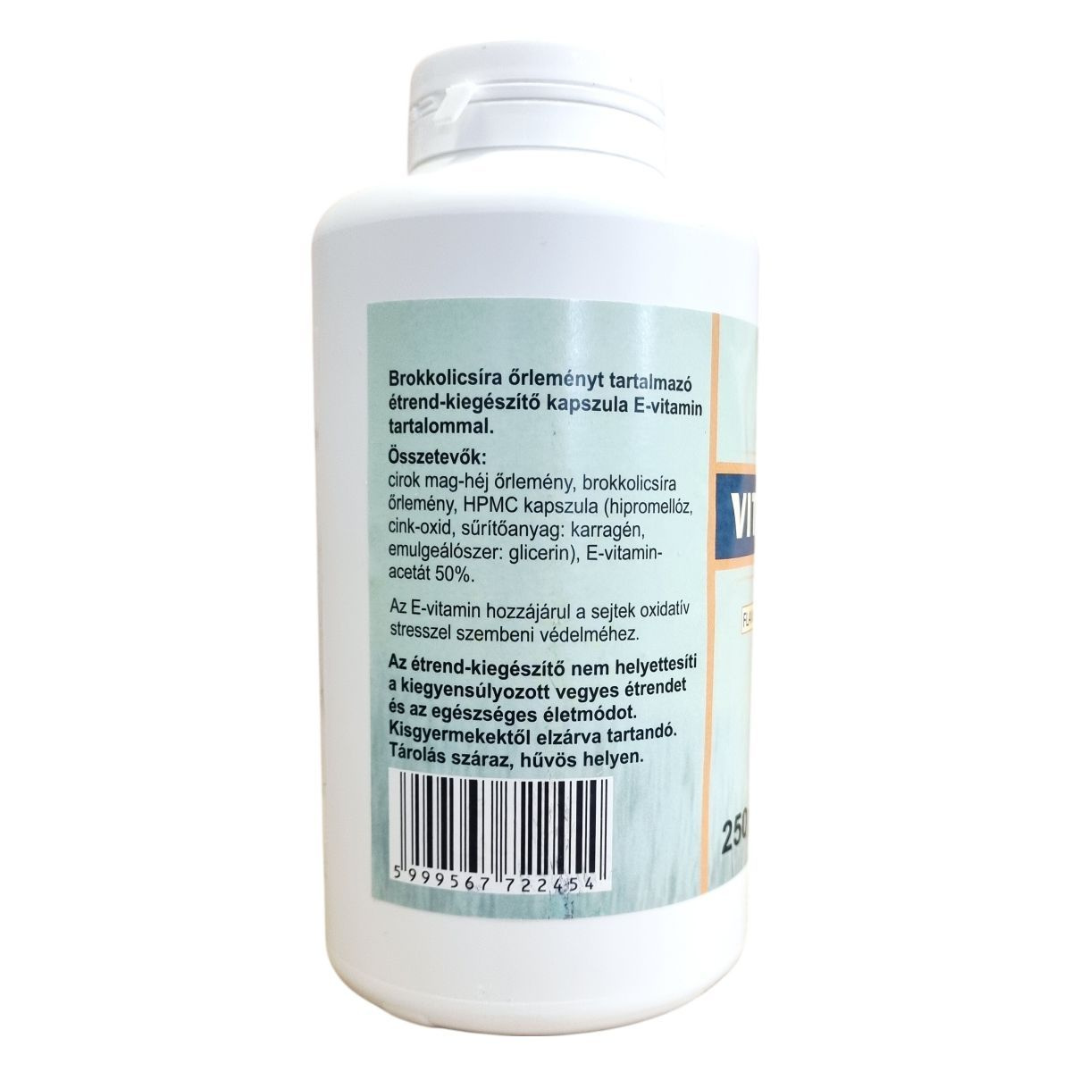 Brokkolicsíra őrleményt tartalmazó étrend-kiegészítő kapszula E-vitaminnal, amely hozzájárul a sejtek oxidatív stresszel szembeni védelméhez.