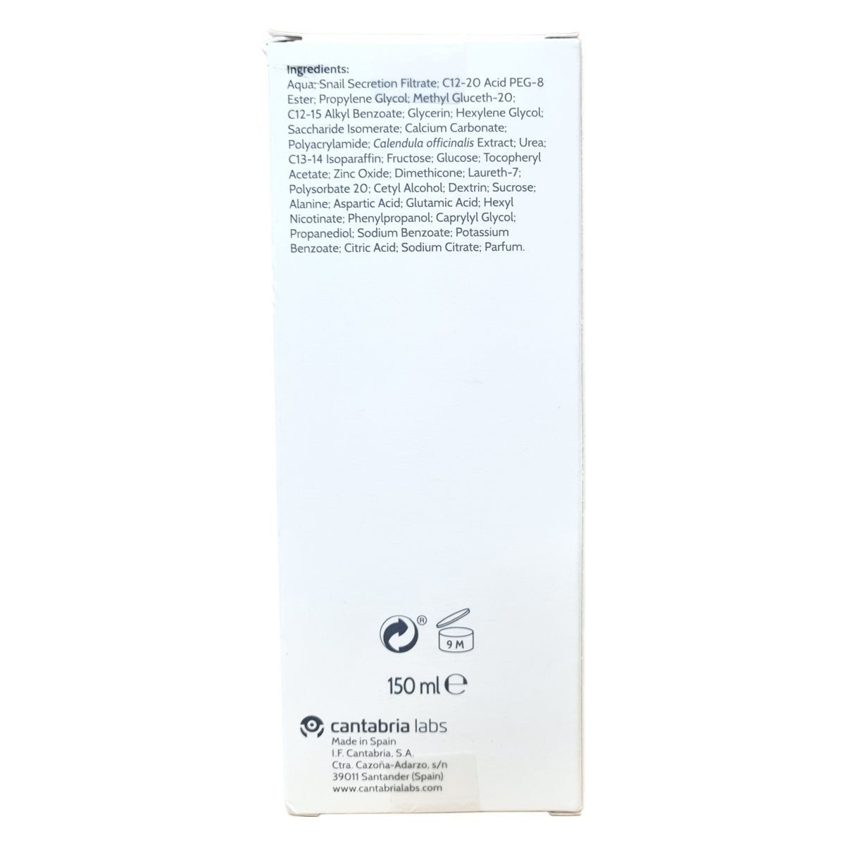 Aqua, Snail Secretion Filtrate, C12-20 Acid PEG-8 Ester, Propylene Glycol, Methyl Gluceth-20, C12-15 Alkyl Benzoate, Glycerin, Hexylene Glycol, Saccharide Isomerate, Calcium Carbonate, Polyacrylamide, Calendula officinalis Extract, Urea, C13-14 Isoparaffin, Fructose, Glucose, Tocopheryl Acetate, Zinc Oxide, Dimethicone, Laureth-7, Polysorbate 20, Cetyl Alcohol, Dextrin, Sucrose, Alanine, Aspartic Acid, Glutamic Acid, Hexyl Nicotinate, Phenylpropanol, Caprylyl Glycol, Propanediol, Sodium Benzoate, Potassium Benzoate, Citric Acid, Sodium Citrate, Parfum.