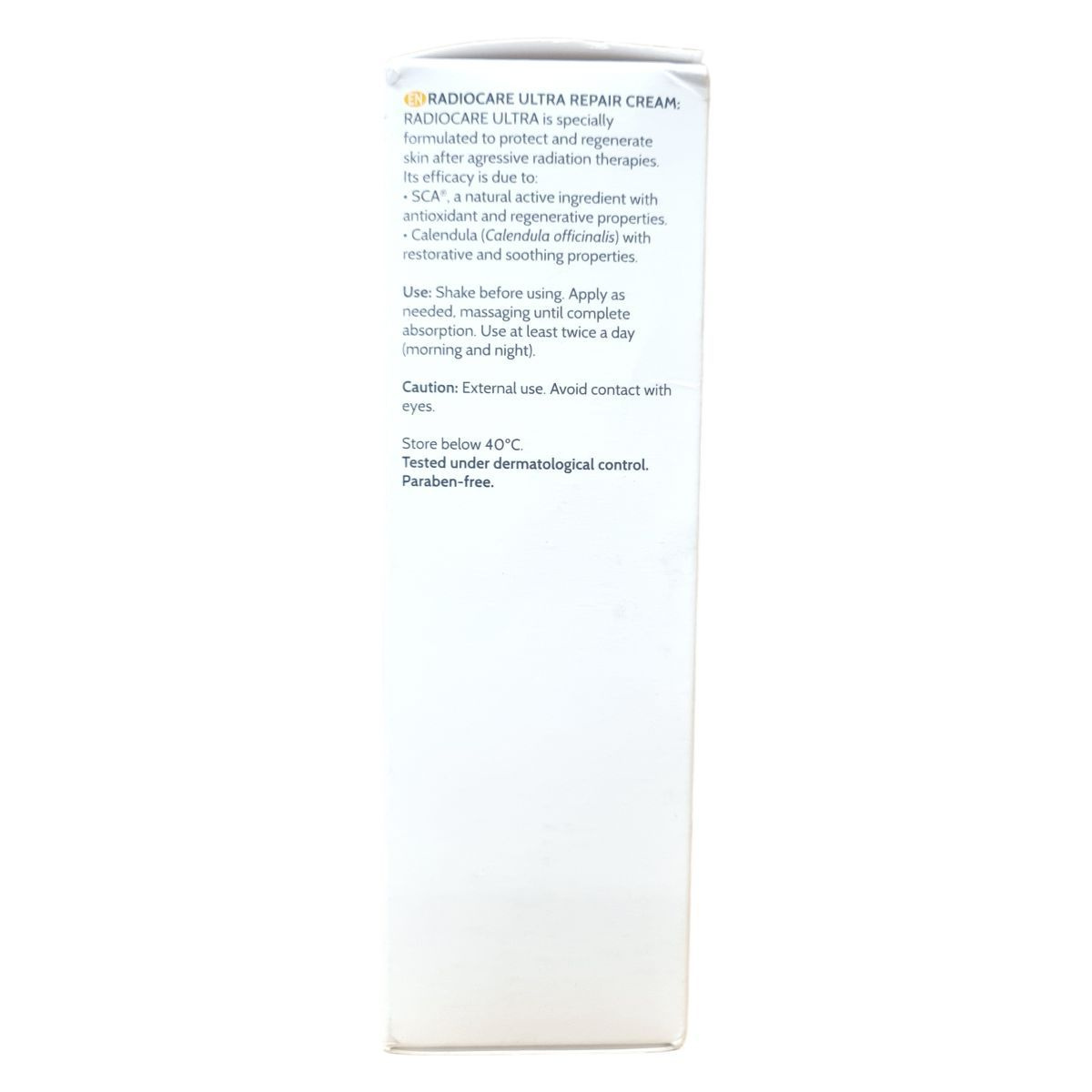 A RadioCare Ultra egy speciálisan sugárterápiák után kifejlesztett bőrvédő és regeneráló krém. Hatékonyságát a SCA® nevű természetes aktív összetevő antioxidáns és regeneráló hatásának, valamint a körömvirág (Calendula officinalis) nyugtató, helyreállító tulajdonságainak köszönheti. Használata javasolt reggel és este, felrázás után, bőrbe masszírozva a teljes felszívódásig. A termék kizárólag külsőleg alkalmazható, kerülni kell a szemmel való érintkezést, és nem ajánlott közvetlenül sugárkezelés vagy napozás előtt használni. Parabénmentes és bőrgyógyászatilag tesztelt. Gondos tárolás mellett, 40°C alatt, gyermekek elől elzárva biztosítható a minősége.