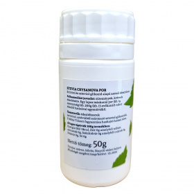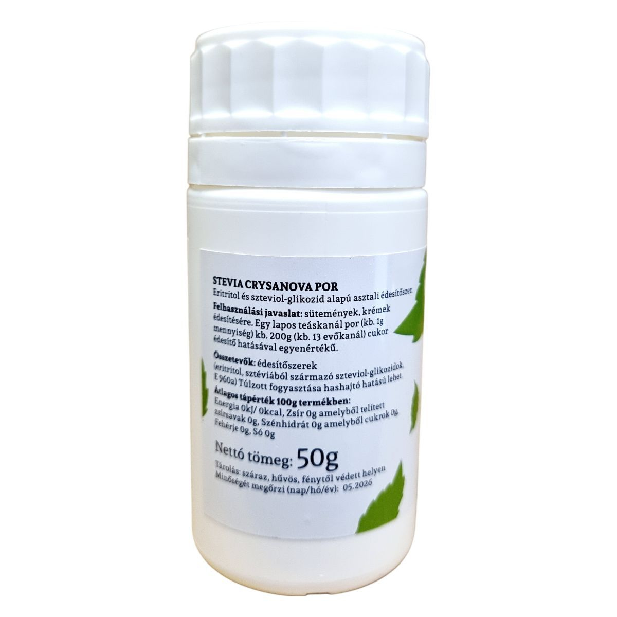 Az 50g-os kiszerelésű CrysaNova Stevia kivonat eritrittel keverve, mely kb. 250-szer édesebb a cukornál.