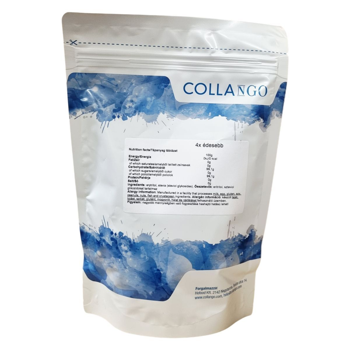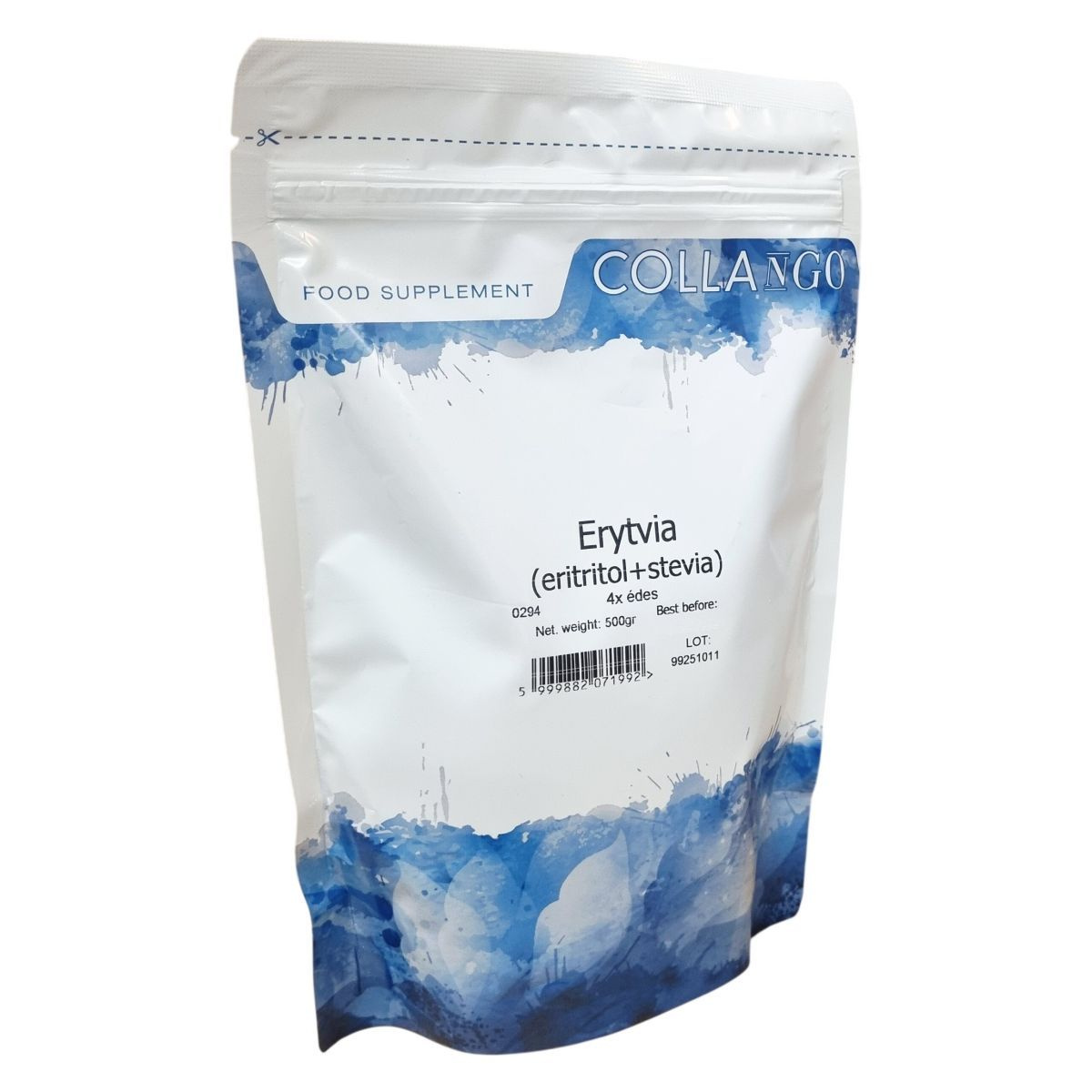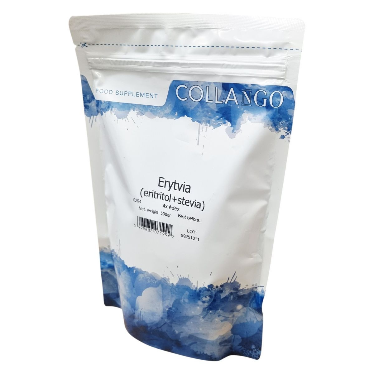 A COLLANGO Erytvia egy édesítőszer, mely eritritol és sztéviaglikozidok keveréke. Termékkódja 0294, és négyszer édesebb a hagyományos cukornál. Nettó tömege 500 gramm. A termék csomagolásán található egy LOT szám: 99251011. Az édesítőszert kizárólag táplálékkiegészítőként kínálják.