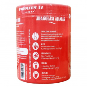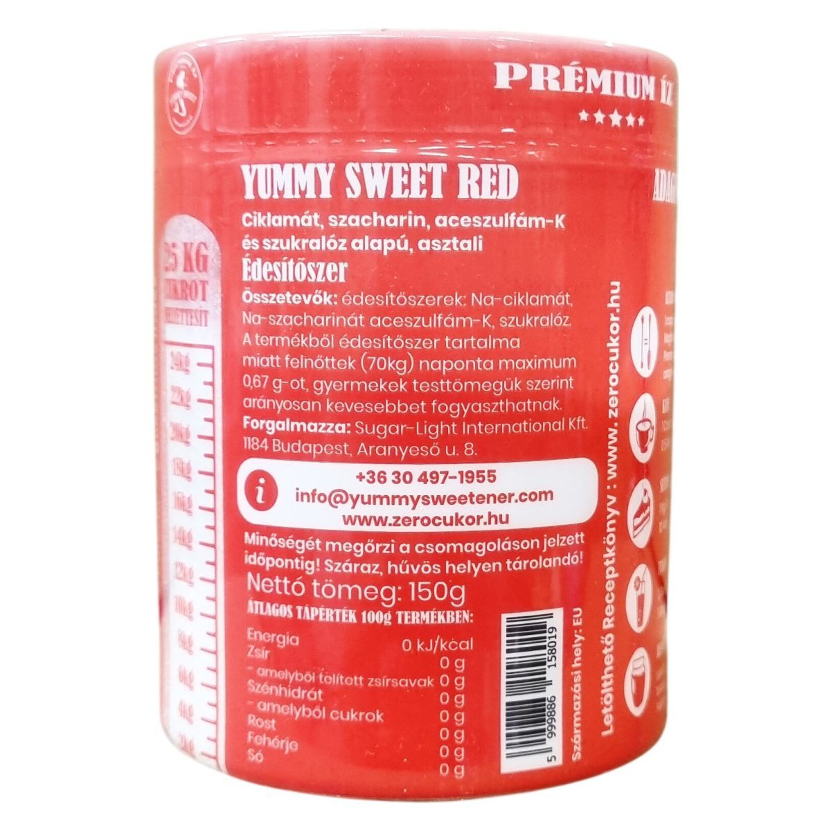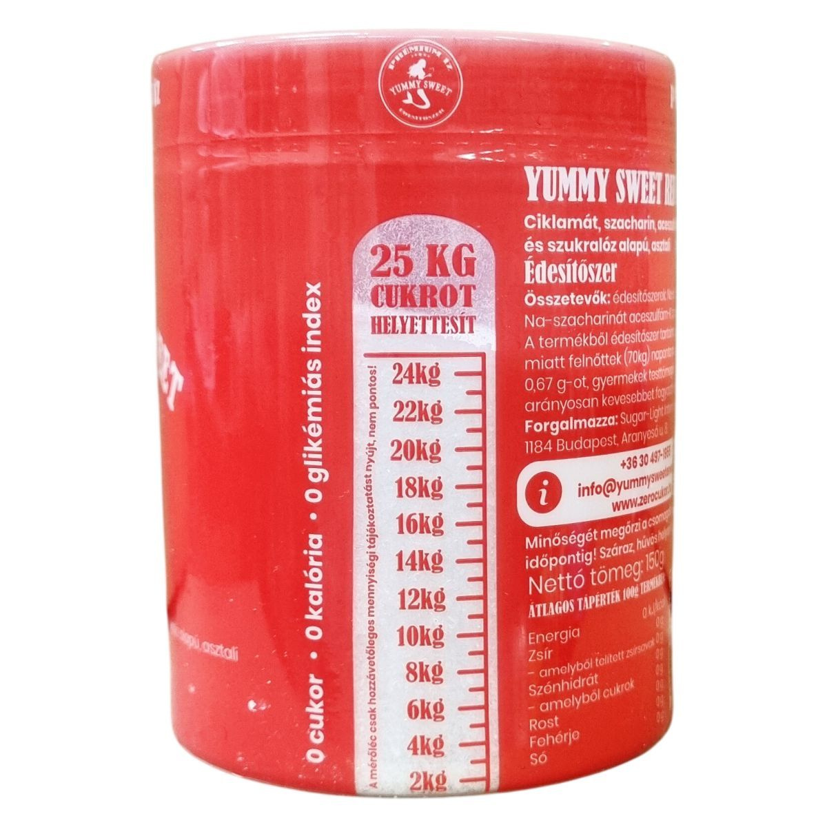 A Yummy Sweet Red édesítőszer ciklamát, szacharin, aceszulfám-K és szukralóz keverékén alapul. Kíméletes alternatíva a cukorral szemben, amit akár 25 kg cukor helyettesítésére is alkalmas lehet. Termék 0 kalóriás és nem emeli a glikémiás indexet, ezért ideális cukormentes diétához és cukorbetegek számára. A termék EU-ból származik, nettó tömege 150 g. A csomagoláson jelzett időpontig megőrzi minőségét. A mérőléce a mennyiség hozzávetőleges meghatározására szolgál, nem pontos mérőeszköz. Letölthető receptkönyv is elérhető az ajánlott weboldalon.