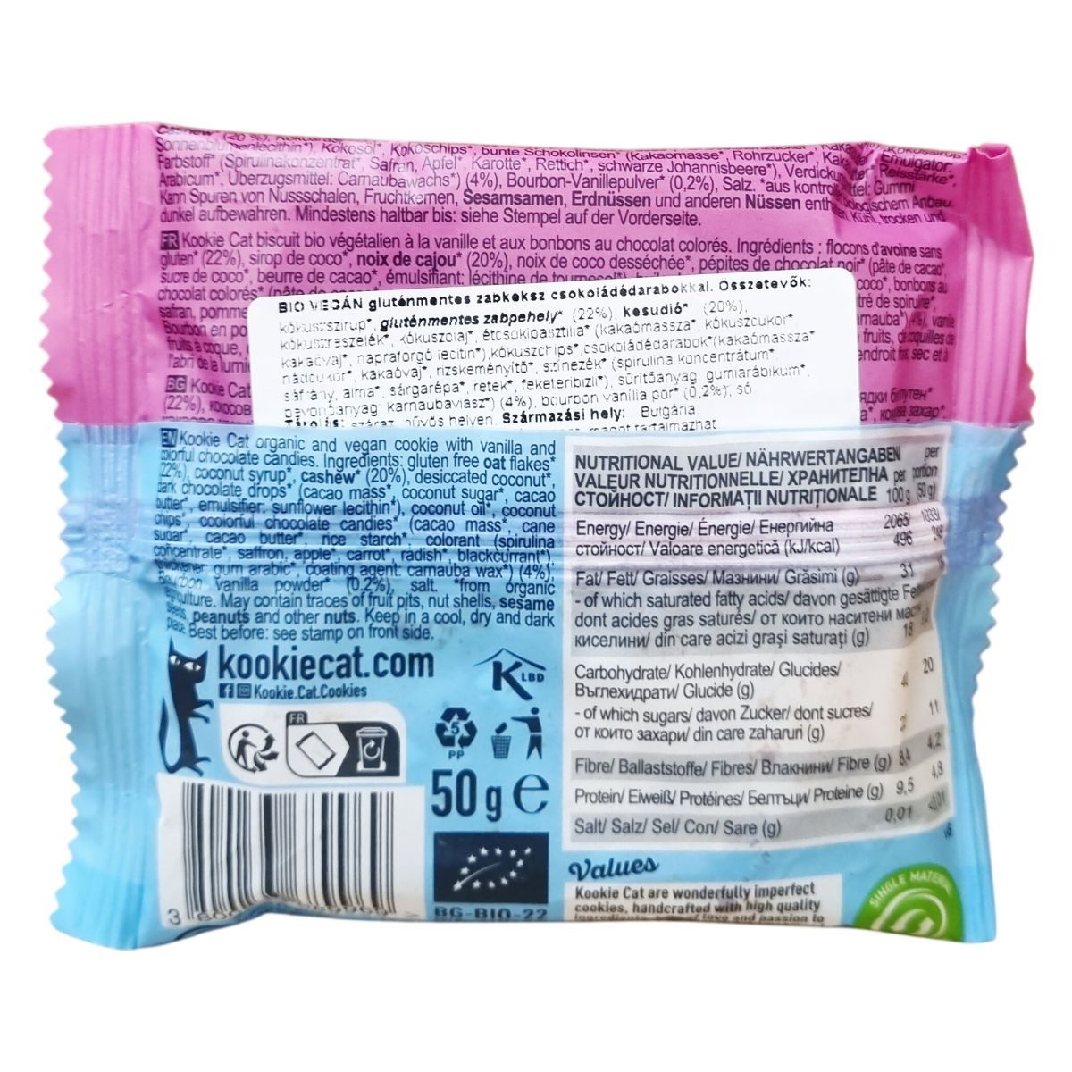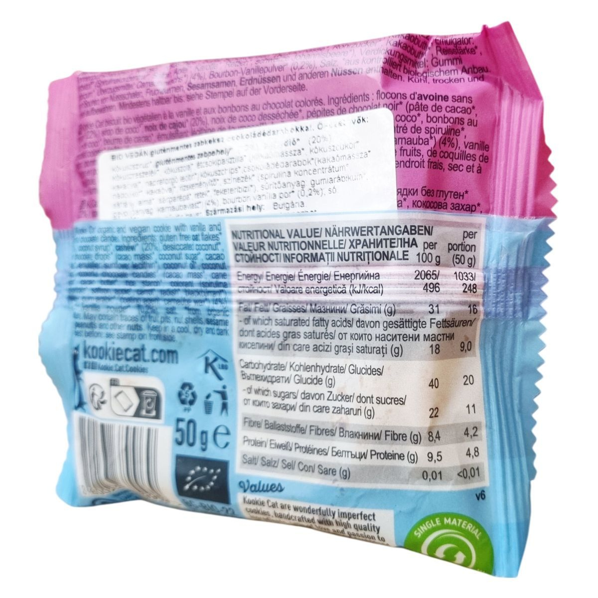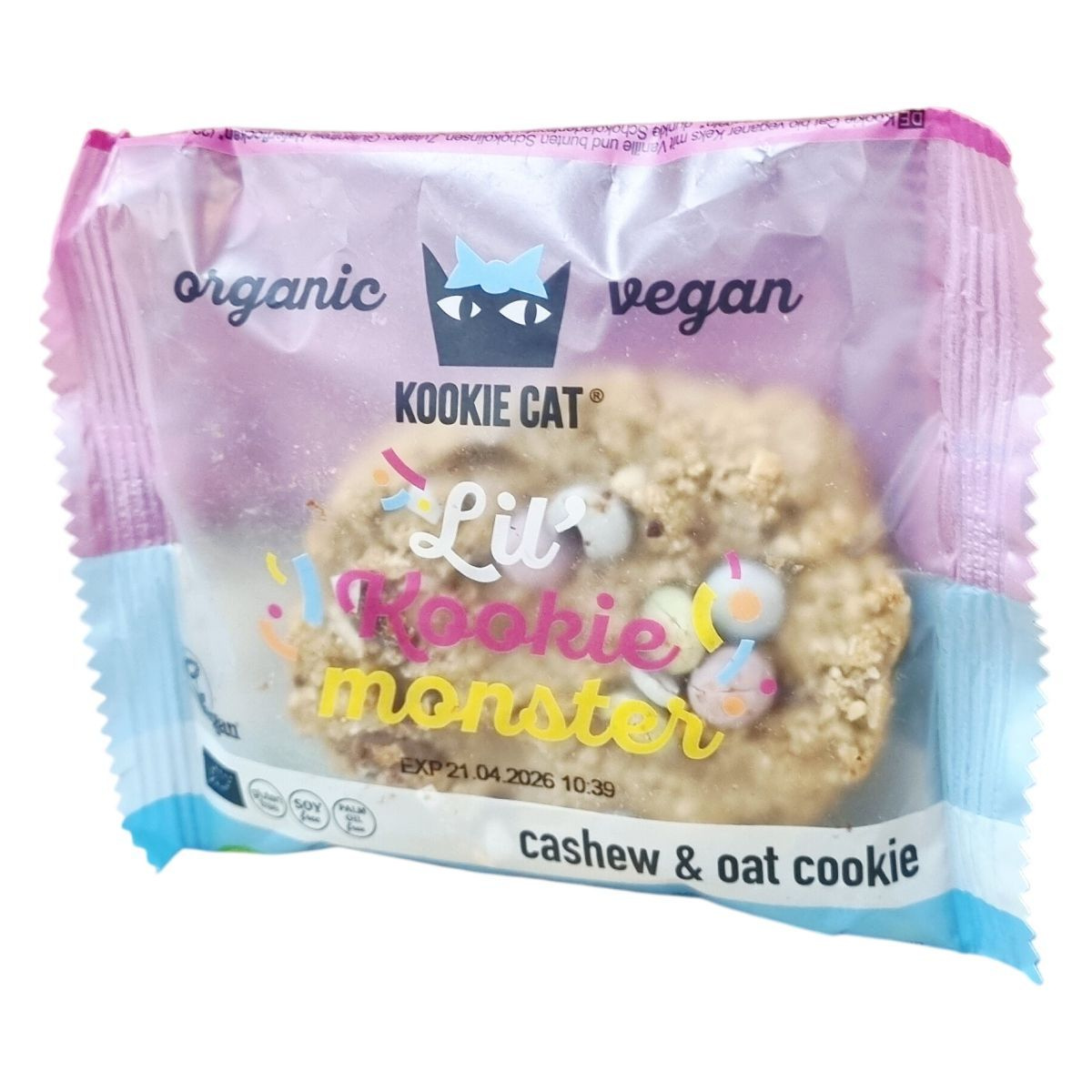 A Lil’ Kookie Monster egy organikus, vegán keksz gluténmentes zabpehelyből, kesudióval és színes csokoládédarabokkal. Természetes növényi színezékeket és bio alapanyagokat tartalmaz.