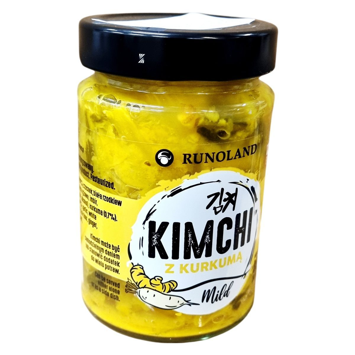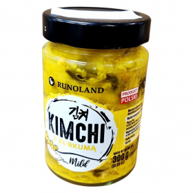 A RUNOLAND vegán kurkumás kimchi egy pasztőrözött, természetesen fermentált termék, amelyet Lengyelországban gyártanak. Fő összetevői között szerepel a kínai kelkáposzta, fokhagyma, fehér retek, valamint speciális adalékok, mint a rizsliszt, gyömbér és miso paszta, mely szójatartalmú. A kimchi enyhén fűszerezett kurkuma hozzáadásával készült, amely jellegzetes, kellemes aromát kölcsönöz neki. Felhasználható önálló fogásként vagy számos étel kiegészítőjeként, megőrizve jellegzetes savanykás ízét. A csomagolás 300 grammos, és ajánlott hideg, száraz helyen tárolni, illetve felbontás után gyors fogyasztása szükséges a minőség megőrzése érdekében.