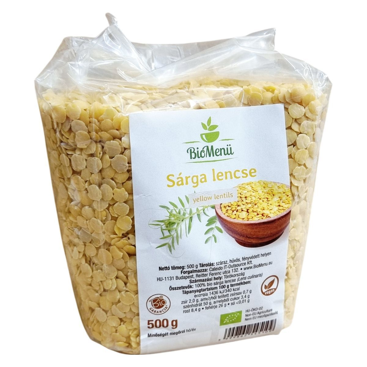 A sárga lencse Törökországból származik, és kizárólag nem EU mezőgazdaságból származó, bio minőségű alapanyagból készül. A termék nettó tömege 500 gramm, és a csomagoláson a minőségmegőrzési idő szerepel. A termék a Bio GARANCIA jelöléssel rendelkezik, és a csomagolásán megtalálható a vonalkód és a gyártási tételazonosító (LOT25702).