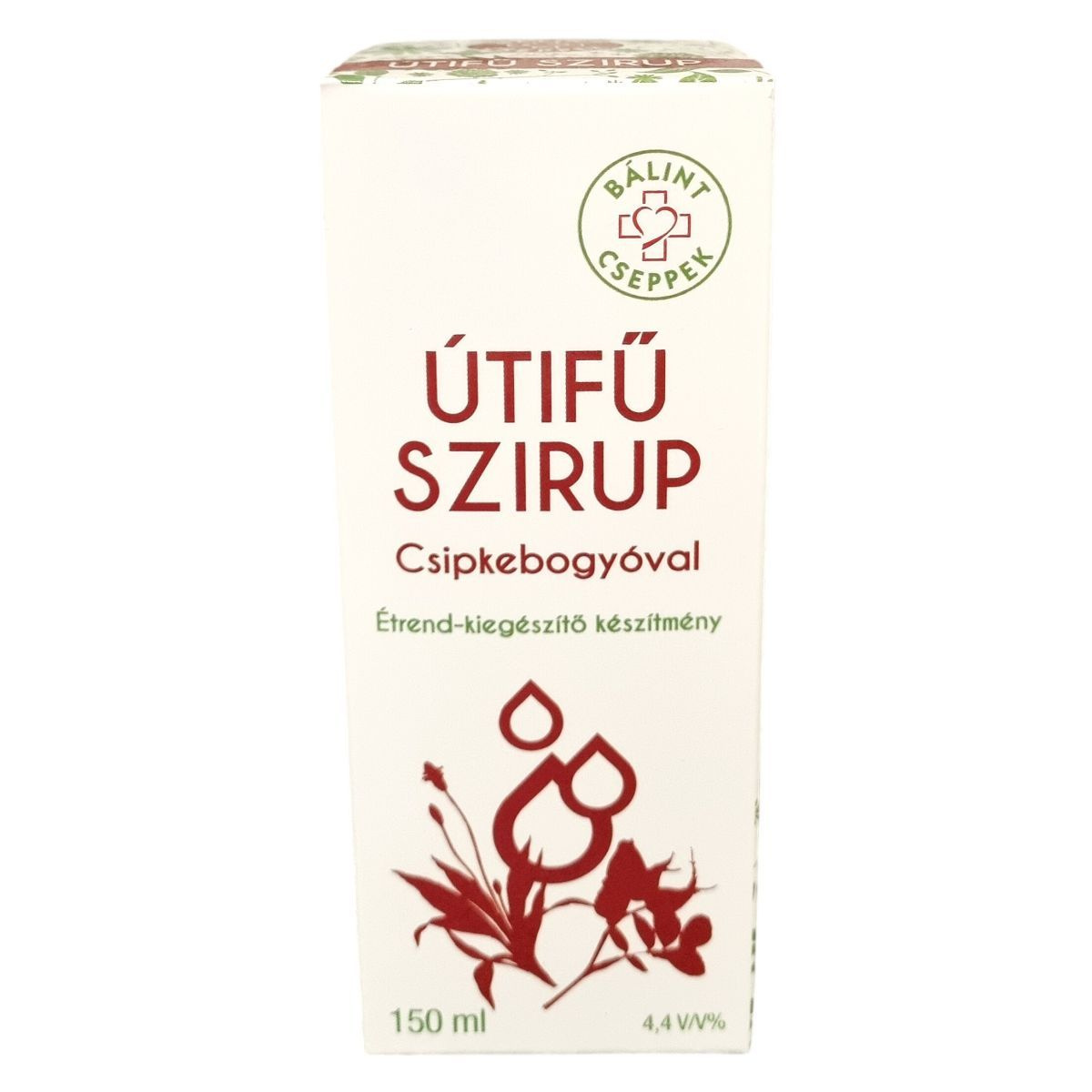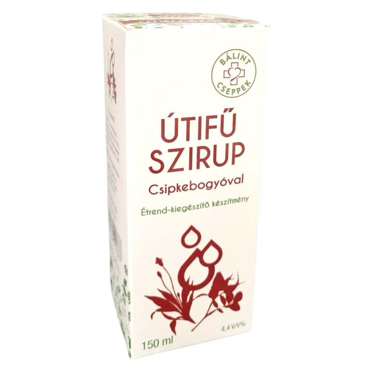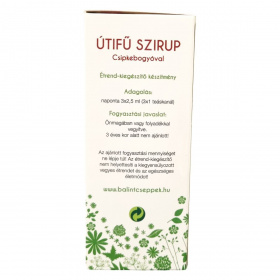 A BÁLINT ÚTIFŰ SZIRUP Csipkebogyóval 4,4 V/V% alkoholtartalmú, 150 ml-es kiszerelésű termék. Hatóanyag-tartalma lándzsás útifű kivonat, amely 37,5 mg mennyiségben található meg 7,5 ml napi adagban. Az összetevők között fehér szőlőlé sűrítmény, csipkebogyó sűrítmény (10%), valamint a növényi alapú lándzsás útifű kivonat szerepel. A termék magyarországi származású, és javasolt adagolása naponta háromszori, egyenként 2,5 ml (egyszeri teáskanálnyi mennyiség). A szirup fogyasztása 3 éves kor alatt nem ajánlott, és ajánlott nem túllépni az ajánlott napi mennyiséget. Felhívja a figyelmet arra, hogy az étrend-kiegészítő nem helyettesíti a kiegyensúlyozott vegyes étrendet és az egészséges életmódot. A terméket szobahőmérsékleten, fénytől védett, hűvös helyen, gyermekektől elzárva kell tárolni.