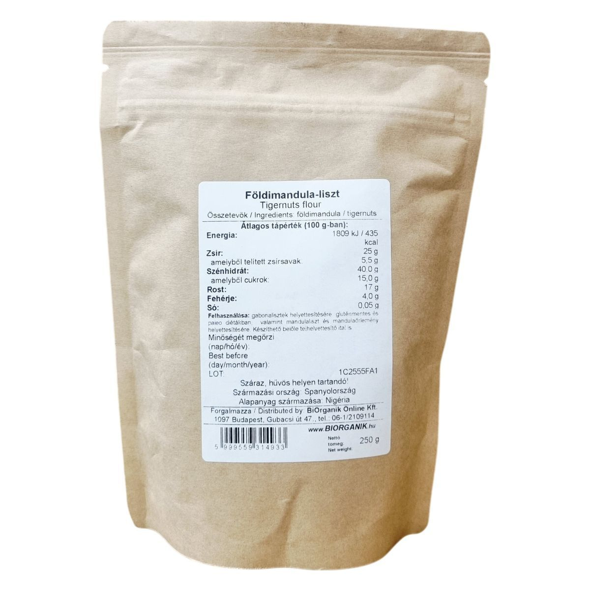 A termék spanyolországi származású, alapanyaga Nigériából származik. A földimandula-liszt egy sokoldalúan felhasználható alapanyag, mely ideális a gluténérzékenyek és a paleo étrendet követők számára. A termék vegán, és magas rosttartalma mellett jelentős mennyiségű zsírt, valamint mérsékelt fehérjetartalmat is tartalmaz.