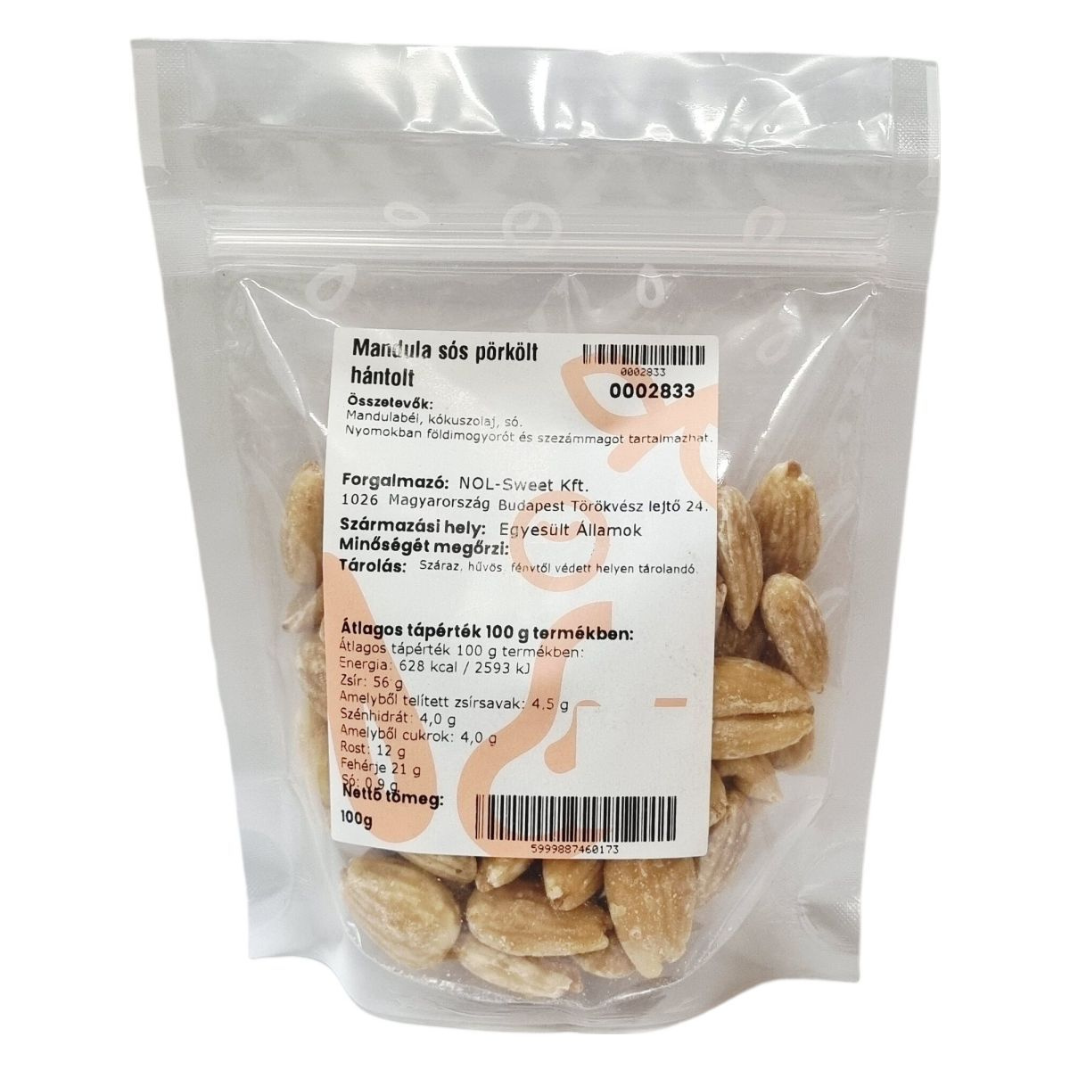 A magyarországi forgalmazó által kínált termék az Egyesült Államokból származó hántolt mandulabélből készült. A mandulát kókuszolajjal és sóval ízesítették, így alakul ki a pörkölés utáni jellemző sós ízvilág. A termék 100 grammos kiszerelésben érhető el és kizárólag száraz, hűvös helyen, fénytől védve tartandó. A csomagoláson található vonalkód: 5999887460173. A termék nem tartalmaz felhasználási vagy elkészítési útmutatót, így készen fogyasztható.