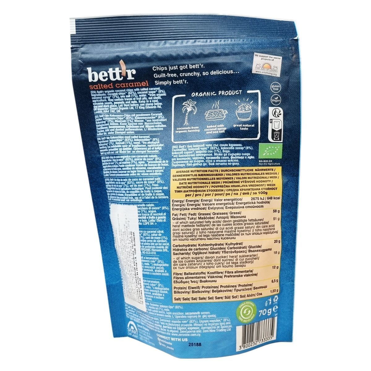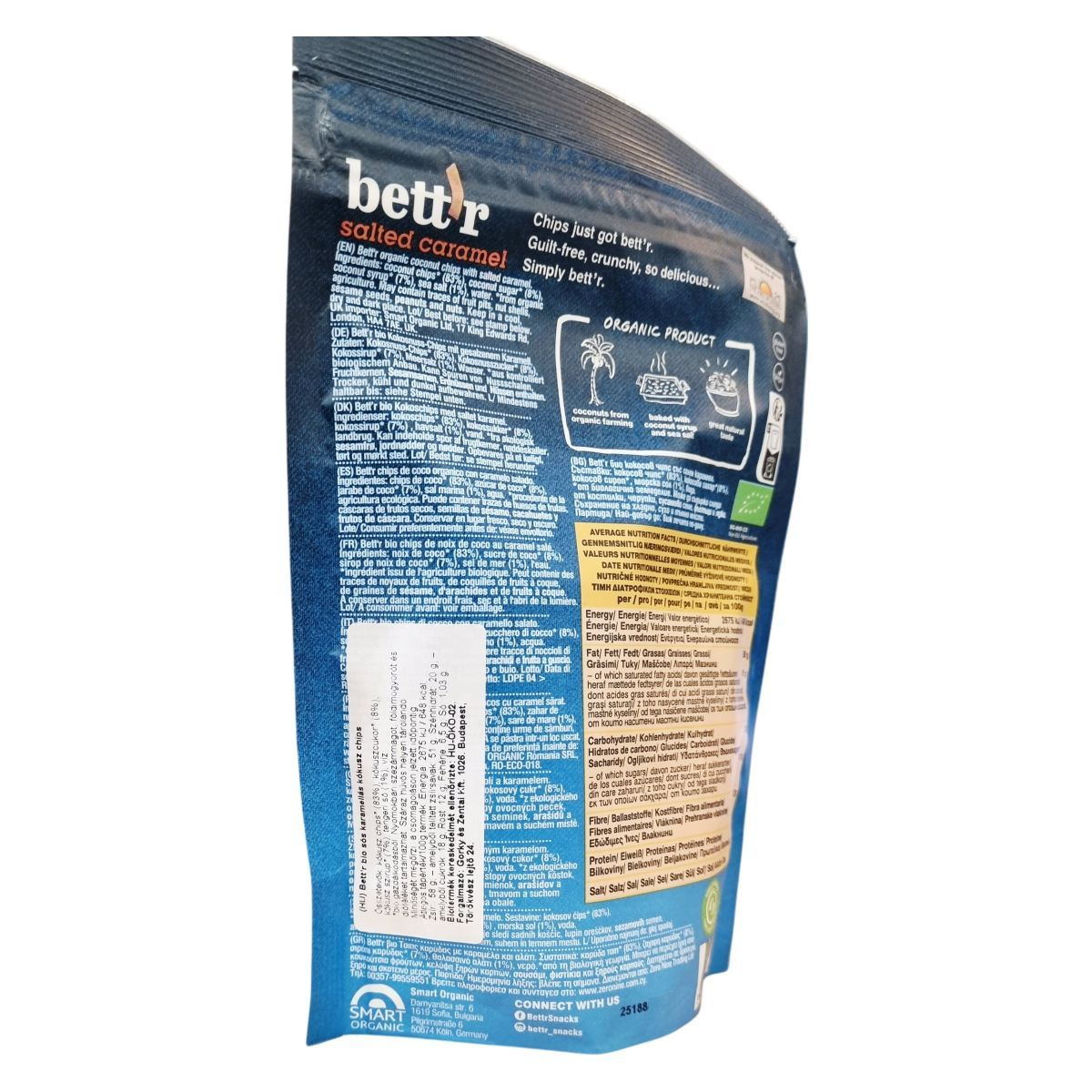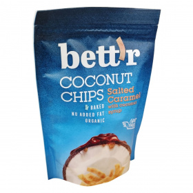 A bett'r salted caramel Coconut Chips organikus gazdálkodásból származó kókuszdióból készülnek, amelyeket kókuszcukorral és kókusz sziruppal, valamint tengeri sóval ízesítenek. A termék hozzáadott zsiradék nélkül, sütéssel készül, így egészséges választás azok számára, akik természetes, ropogós snackre vágynak. Különös figyelmet fordítanak az allergénekre, ezért előfordulhatnak természetes eredetű nyomok, például gyümölcsmagok, dióhéjak, szezámmag, földimogyoró és egyéb diófélék. Gluténmentes és vegán termék, amely kiváló alternatíva a hagyományos chipset és édességeket kedvelők számára. A termék megfelelő tárolása biztosítja a frissességet és az ízmegőrzést. Importőr: Smart Organic Ltd, London.