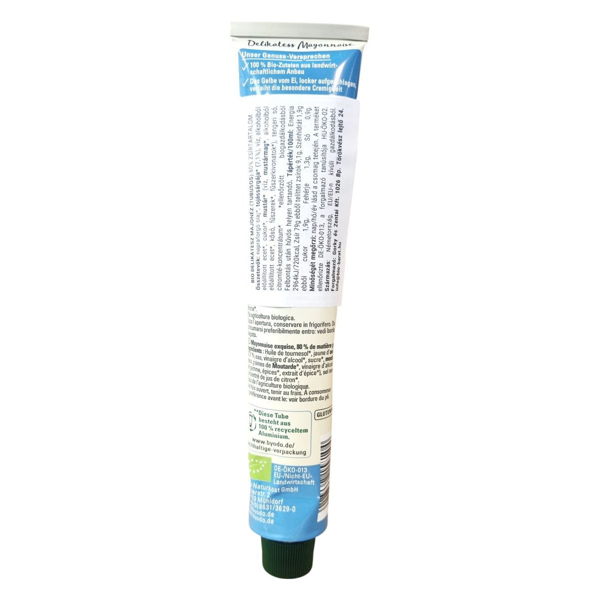 Ez a bio minőségű delikatess majonéz 80% zsírtartalommal rendelkezik, kiváló minőségű, mezőgazdasági körülmények között termesztett alapanyagokból készült. A különleges krémességet a laza, habosított tojássárgája adja, amely a terméket egyedivé teszi. A tubus 100% újrahasznosított alumíniumból készült, így környezetbarát csomagolású. A termék Németországból származik, és megfelel a szigorú ökológiai tanúsítványoknak. Kiváló választás mindazok számára, akik a környezettudatos és természetes alapanyagokból készült majonézt részesítik előnyben.