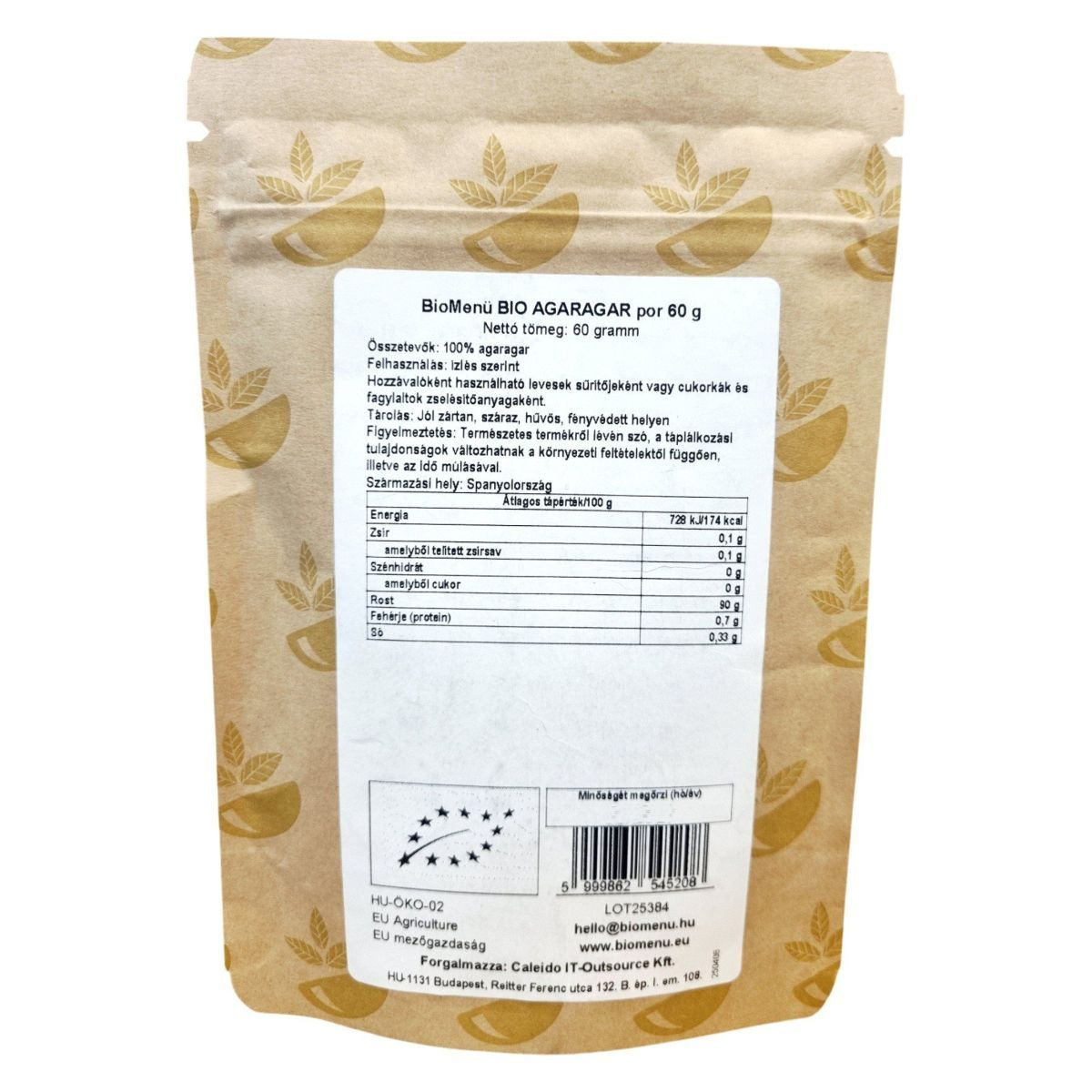 A BioMenü Agaragar por egy organikus, 100% tisztaságú agaragar termék, amely Spanyolországból származik. A termék bio, raw és vegán minősítéssel rendelkezik, és kiválóan alkalmas levesek sűrítésére, valamint cukorkák és fagylaltok zselésítésére. A termék táplálkozási tulajdonságai változhatnak a környezeti feltételektől függően. A termék csomagolásán található HU-ÖKO-02 tanúsítvány igazolja az organikus minőséget. A terméket a Caleido IT-Outsource Kft. forgalmazza, székhelye Budapest, Reitter Ferenc utca 132. B. ép. I. em. 108.
