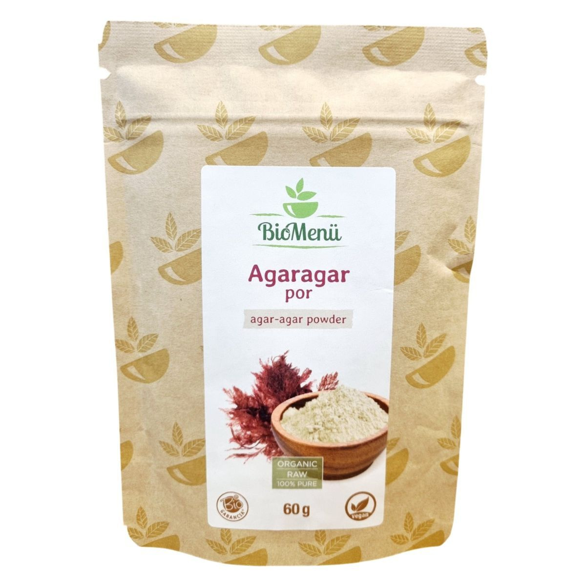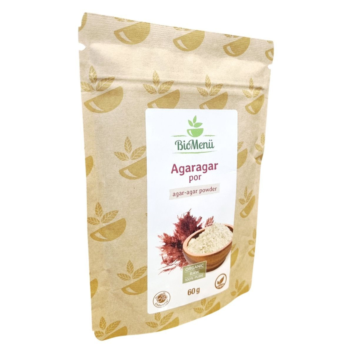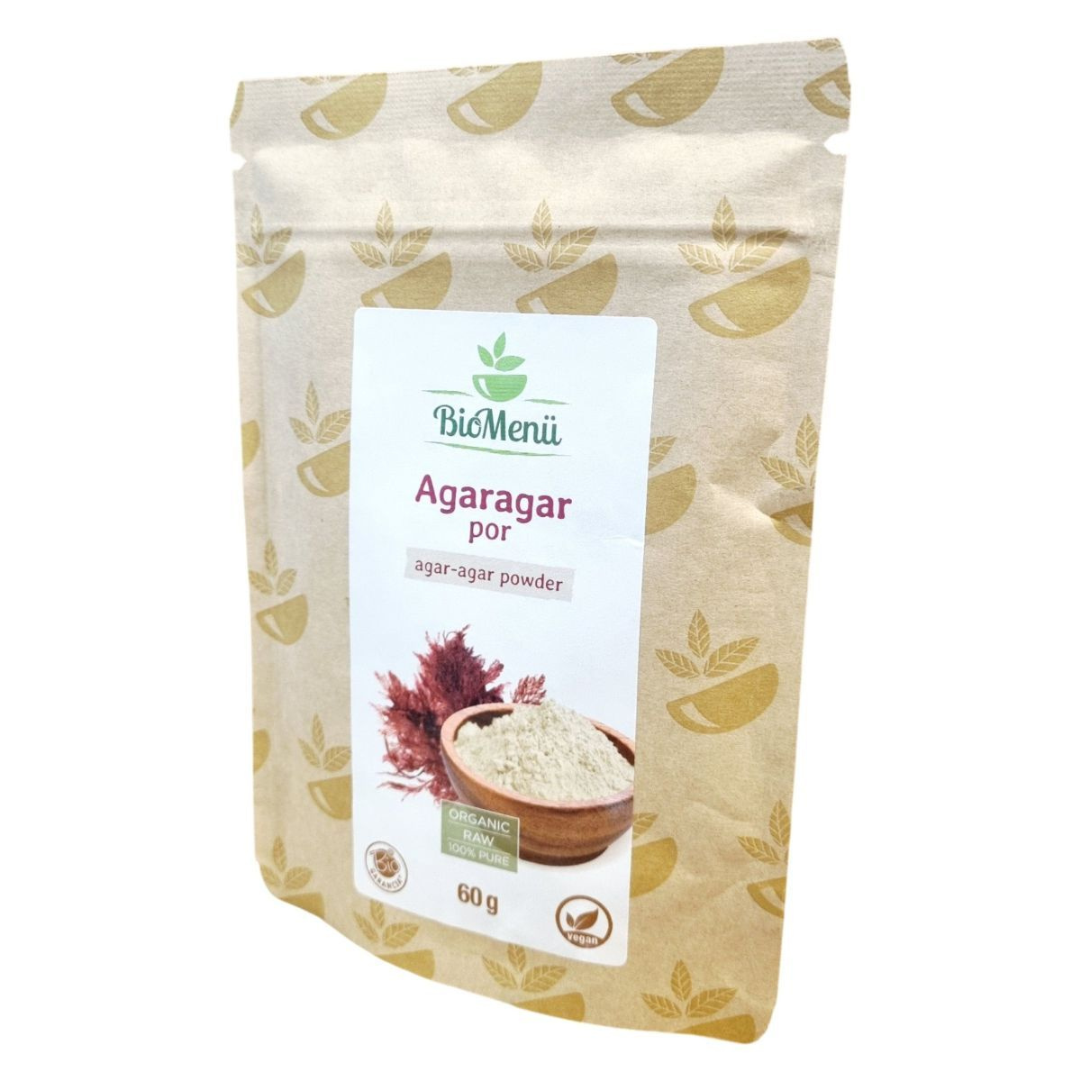 A BioMenü Agaragar por egy 100% tisztaságú, organikus, vegán és raw termék, amelyet levesek sűrítőjeként vagy cukorkák és fagylaltok zselésítőanyagaként használhatunk. Nettó tömege 60 gramm.