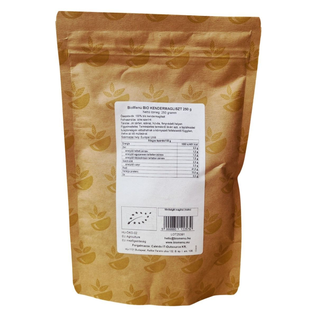 A BioMenü BIO Kendermagliszt egy 250 grammos kiszerelésű, 100% tisztaságú bio termék, amelyet az Európai Unióban termesztett kendermagból készítenek. A termék organikus, nyers és vegán, így ideális választás az egészséges életmód követői számára. A kendermagliszt gazdag rostokban és fehérjében, alacsony szénhidráttartalommal rendelkezik, és nem tartalmaz sót. A termék minőségét a HU-ÖKO-02 tanúsítvány garantálja. A kendermaglisztet ízlés szerint lehet felhasználni, és javasolt jól zártan, száraz, hűvös, fényvédett helyen tárolni. A termék forgalmazója a Caleido IT-Outsource Kft., amely Budapesten található.