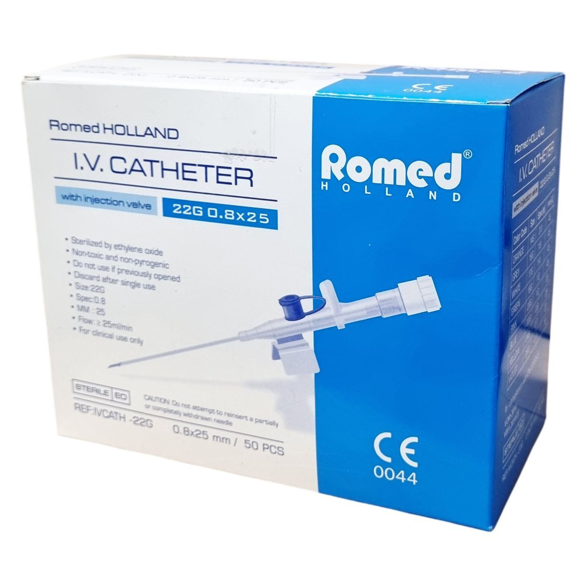 A Romed HOLLAND I.V. katéter injekciós szeleppel 22G méretben készült, 0.8 mm átmérővel és 25 mm hosszúsággal. A termék steril, etilén-oxiddal sterilizált, és kizárólag klinikai használatra alkalmas. A katéter az EN-10555-5 szabványnak megfelel, és többszörösen bevizsgált. Többféle méretben és színkódokkal elérhető, melyek az adott átmérőt és hosszúságot jelzik. A termék kizárólag egyszeri használatra készült, nem újra sterilizálható vagy használható vissza, a fertőzésveszély minimalizálása érdekében. A termék csomagolása 50 darabot tartalmaz, és megfelel az európai minőségi és biztonsági előírásoknak.