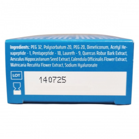 Polietilénglikol 32 (PEG 32), poliszorbát 20 (Polysorbatum 20), polietilénglikol 20 (PEG 20), dimetikon (Dimeticonum), acetil-hexapeptid-1, pentapeptid-18, Laureth-9, tölgykéreg-kivonat (Quercus Robur Bark Extract), vadgesztenye-mag kivonat (Aesculus Hippocastanum Seed Extract), körömvirág-virág kivonat (Calendula Officinalis Flower Extract), kamillavirág-kivonat (Matricaria Recutita Flower Extract), nátrium-hialuronát (hialuronsav)