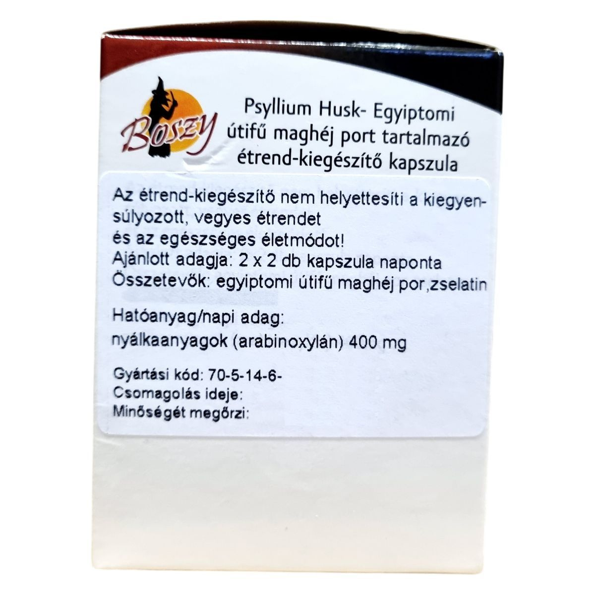 A Boszey Psyllium Husk kapszula egy étrend-kiegészítő, amely egyiptomi útifű maghéj port tartalmaz. A termék 60 db kapszulát tartalmaz, nettó tömege 24g. Az egyiptomi útifű maghéj hozzájárulhat az emésztőrendszer megfelelő működéséhez. A termék származási helye az EU, és a Gyógyfű Kft forgalmazza. Fontos, hogy a termék nem helyettesíti a kiegyensúlyozott étrendet és az egészséges életmódot. A fogyasztók számára ajánlott, hogy ne lépjék túl az ajánlott napi mennyiséget, és tartsák távol a terméket kisgyermekektől.