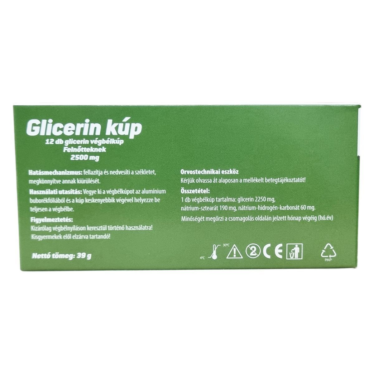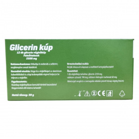 Használati utasítás: vegye ki a végbélkúpot az alumínium buborékfóliából és a kúp keskenyebbik végével helyezze be teljesen a végbélbe. Figyelmeztetés: kizárólag végbélnyíláson keresztül történő használatra! Kisgyermekek elől elzárva tartandó! Összetétel: 1db glicerin kúp tartalma: glicerin: 2250 mg, nátrium-sztearát: 190 mg, nátrium-hidrogén-karbonát: 60 mg. Orvostechnikai eszköz.