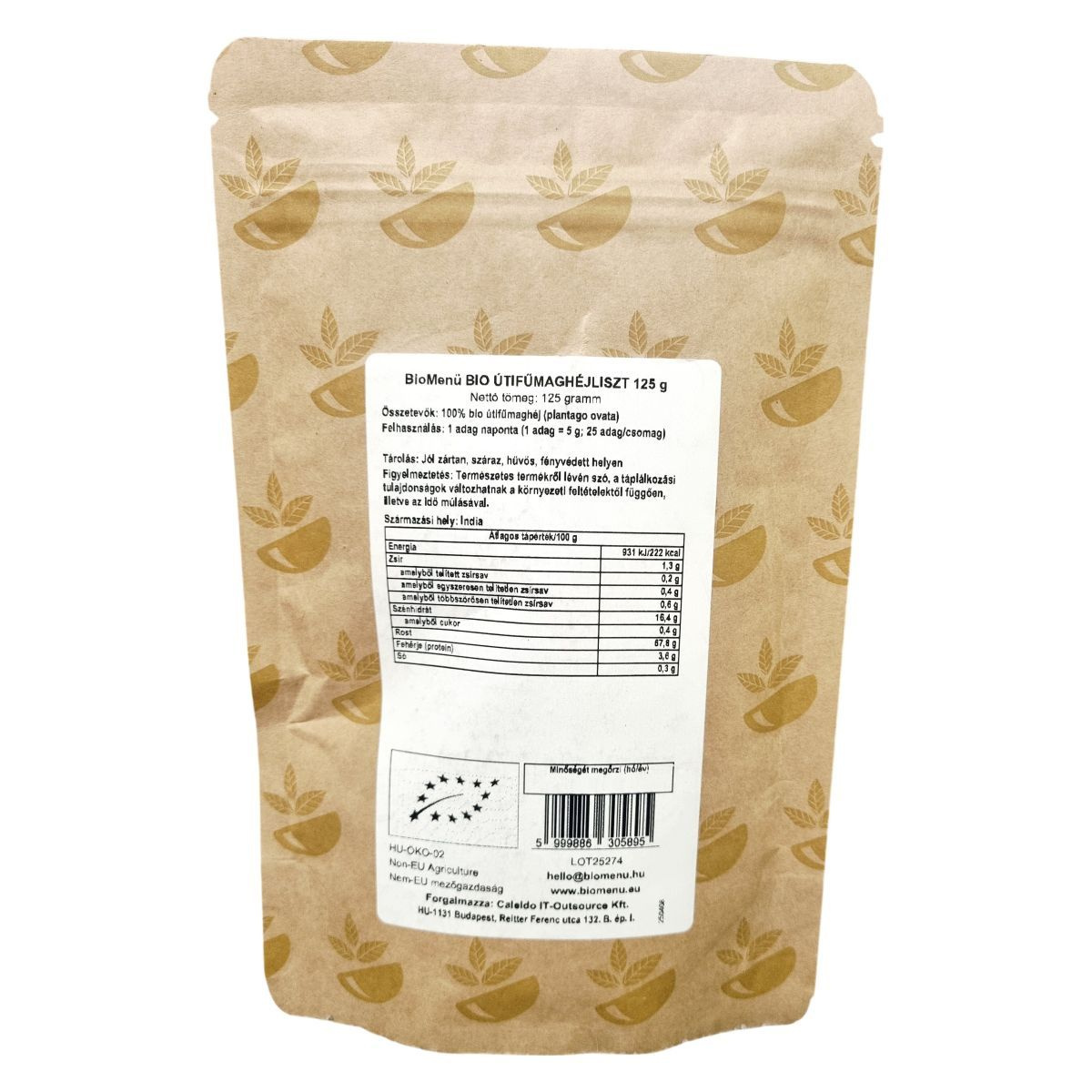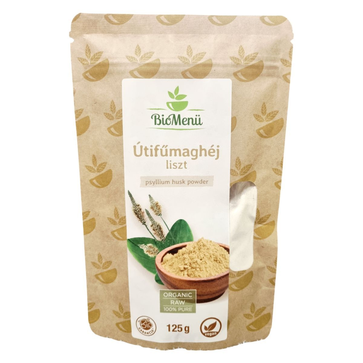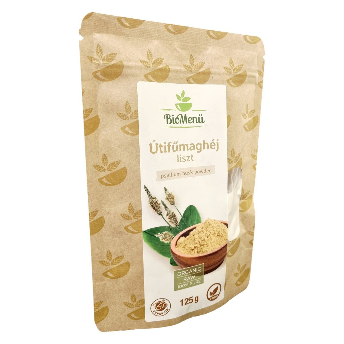 A BioMenü Bio Útifűmaghéjliszt 125 gramm kiszerelésben készül Indiában, nem-EU mezőgazdaságból származó, bio minősítésű alapanyagból. A termék 100%-ban tiszta pszillium héjat tartalmaz, amely tradicionálisan alkalmazott növényi rostforrás. A liszt alkalmas vegán étrendekbe is, nyers és organikus minőségben áll rendelkezésre. A termék minőségmegőrzési időpontja mellett a termék csomagolása garantálja a frissességet és hatóanyag-tartalom megőrzését. Forgalmazója a Caledo IT-Outsource Kft., a csomagoláson megtalálható az HU-ÖKO-02 minősítés, mely a bio tanúsítás forrását igazolja.