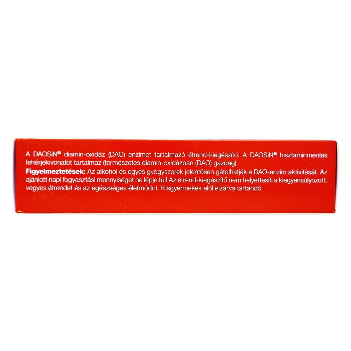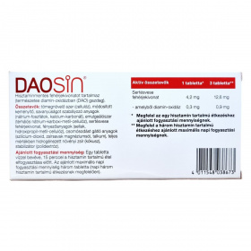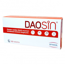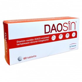 A DAOSiN® egy diamin-oxidáz (DAO) enzimet tartalmazó étrend-kiegészítő, amely hisztaminmentes fehérjekivonatot tartalmazhat, természetes diamin-oxidázban (DAO) gazdag formában. A termék célja, hogy támogassa a hisztamin tartalmú ételek fogyasztását. Az alkohol és egyes gyógyszerek gátolhatják a DAO-enzim aktivitását, ezért fontos, hogy az ajánlott napi fogyasztási mennyiséget ne lépjük túl. A termék nem helyettesíti a kiegyensúlyozott étrendet és az egészséges életmódot. A terméket a STADA Hungary Kft. forgalmazza, és Ausztriából származik.