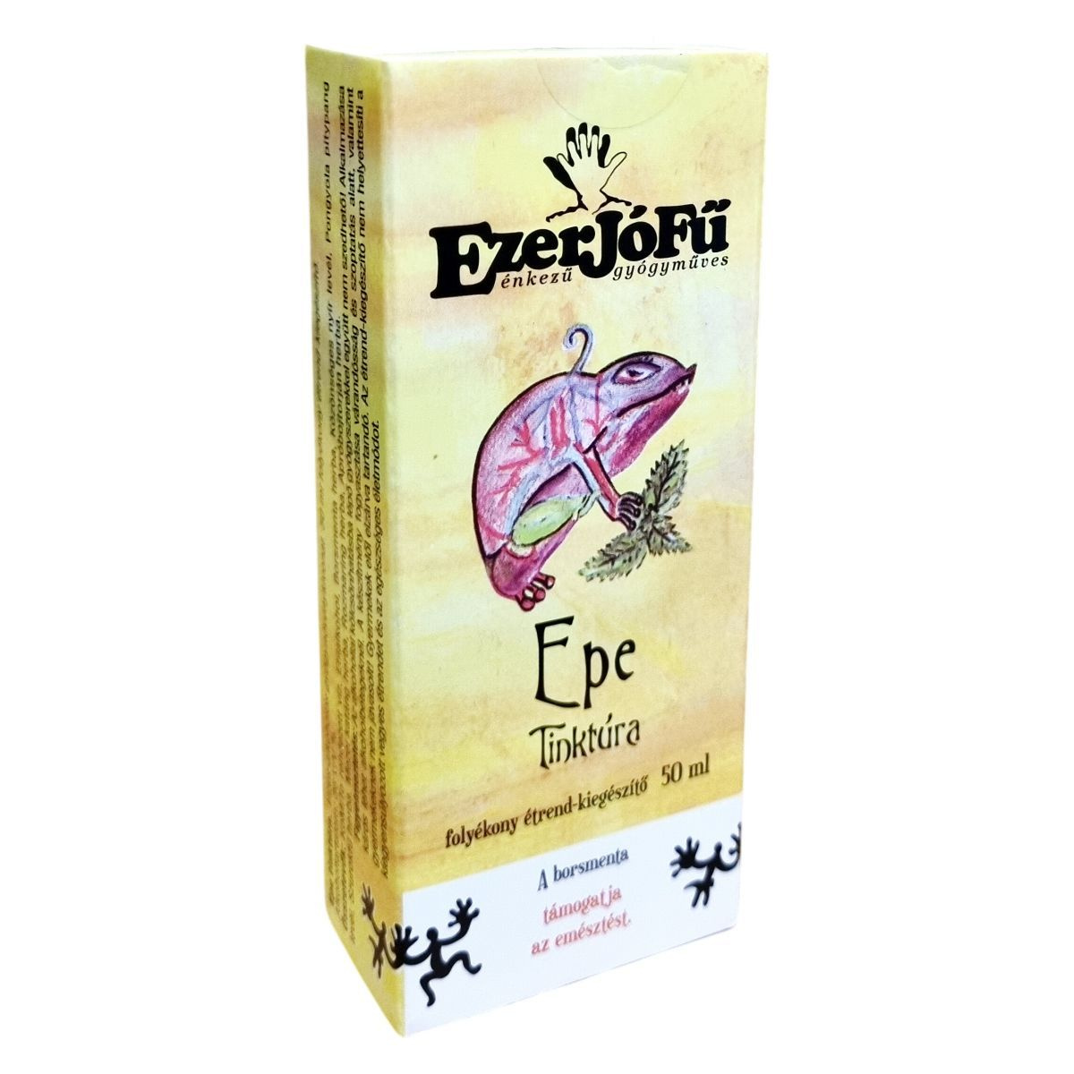 Az EzerJóFű Epe Tinktúra egy 50 ml-es folyékony étrend-kiegészítő, amely borsmentát és apróbojtorjánt tartalmaz, amelyek támogathatják az emésztést és elősegíthetik az epetermelést. A termék vizes-alkoholos gyógynövény kivonat, 36 V/V % alkoholtartalommal. Az ajánlott napi adag 2 ml, amely 400 mg gyógynövény drogokból készül. A termék használata előtt felrázandó, és fénytől védve, szobahőmérsékleten tárolandó. Az étrend-kiegészítő nem helyettesíti a kiegyensúlyozott vegyes étrendet és egészséges életmódot. Gyártja és forgalmazza az Ezerjófű Gyógynövény Kft., Zalaegerszegen.