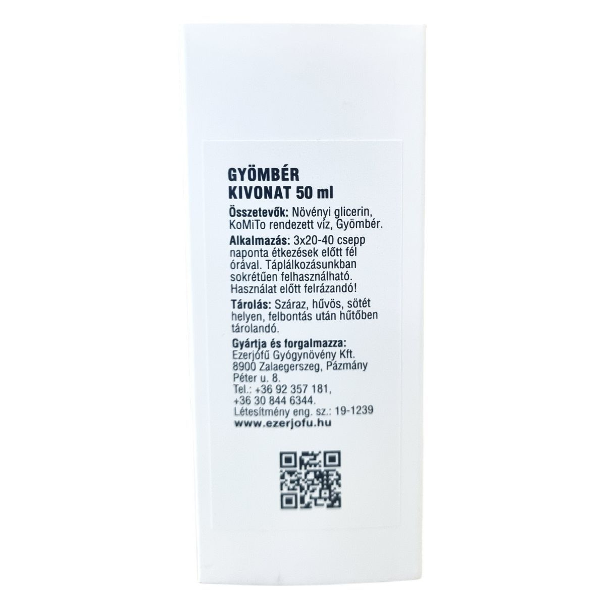 Az EzerJófű Gyömbér Kivonat 50 ml-es kiszerelésben készül alkoholmentes változatban. A termék növényi glicerinből és rendezett vízből áll, melybe gyömbér kivonat került. Használat előtt a flakont fel kell rázni. A fogyasztása naponta háromszor 20-40 csepp ajánlott, étkezések előtt fél órával, így táplálkozásunkban sokféleképpen alkalmazható. A készítmény tárolására a száraz, hűvös és sötét hely ajánlott, bontás után hűtőszekrényben tartandó. A terméket az Ezerjofu Gyógynövény Kft. gyártja és forgalmazza Zalaegerszegen.