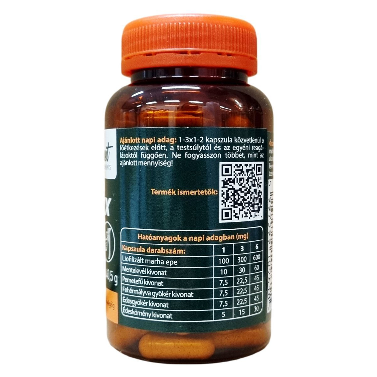 Természetes epesavakat, és gyógynövényeket tartalmazó, bélben oldódó étrend-kiegészítő kapszula.