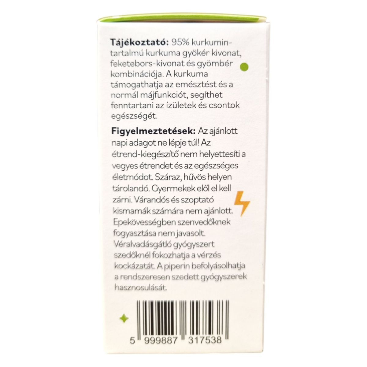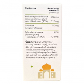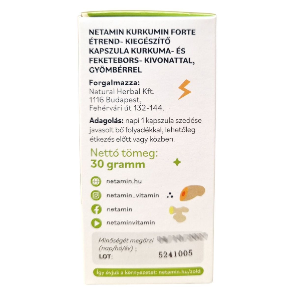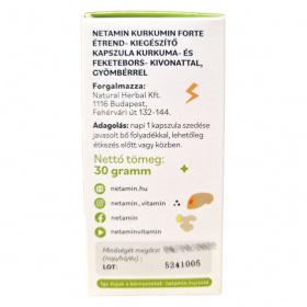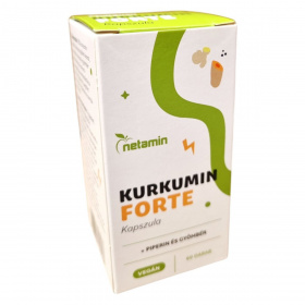A Netamin Kurkumin Forte kapszula egy vegán étrend-kiegészítő, amely kurkuma gyökér kivonatot, feketebors-kivonatot és gyömbért tartalmaz. A termék célja, hogy támogassa az emésztést és a normál májfunkciót, valamint segíthet fenntartani az ízületek és csontok egészségét. A kapszulák napi egy alkalommal történő szedése javasolt, bő folyadékkal, lehetőleg étkezés előtt vagy közben. Fontos, hogy az ajánlott napi adagot ne lépje túl, és a termék nem helyettesíti a vegyes étrendet és az egészséges életmódot. A termék nem ajánlott várandós és szoptató kismamáknak, valamint epekövességben szenvedőknek. A piperin tartalom miatt a termék befolyásolhatja a rendszeresen szedett gyógyszerek hasznosulását.