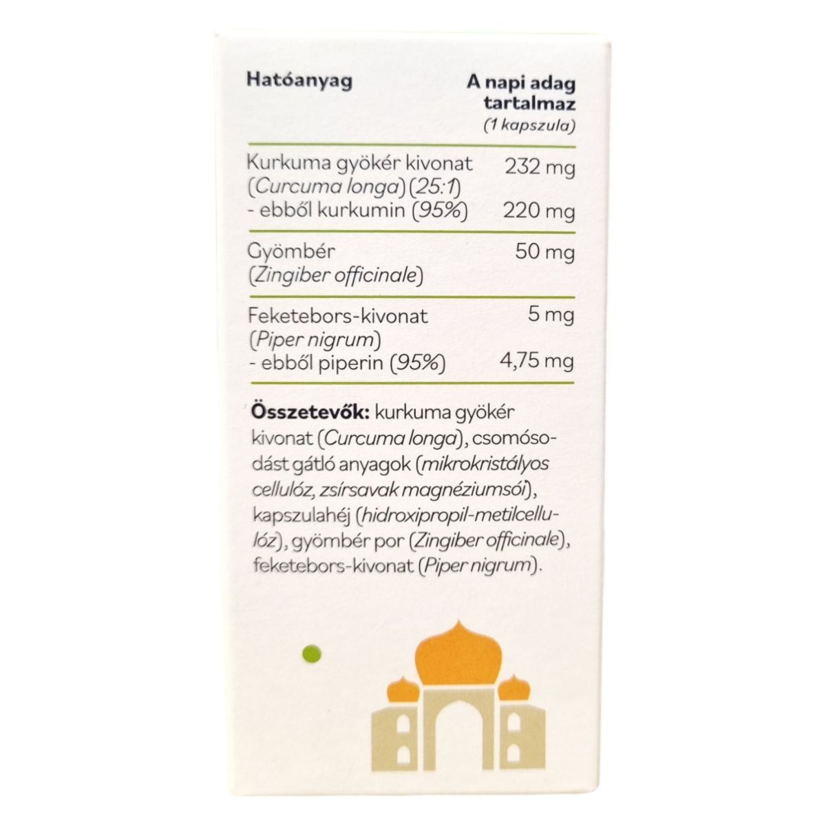 Kurkuma gyökér kivonat (Curcuma longa), csomósodást gátló anyagok (mikrokristályos cellulóz, zsírsavak magnéziumsói), kapszulahéj (hidroxipropil-metilcellulóz), gyömbér por (Zingiber officinale), feketebors-kivonat (Piper nigrum).