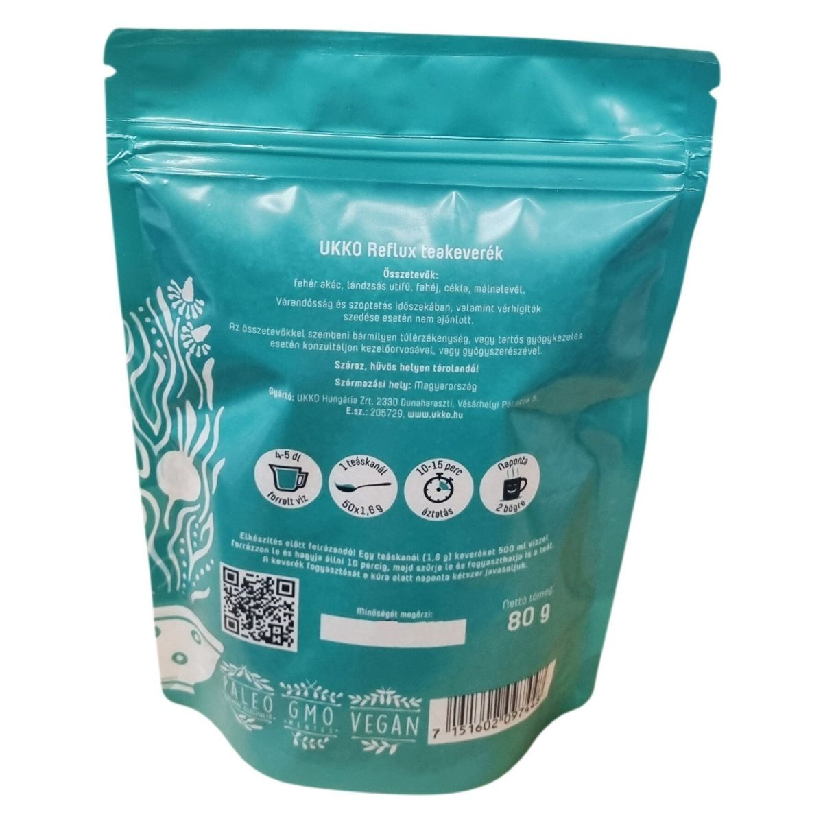 A UKKO Reflux teakeverék egy gondosan összeállított gyógynövény keverék, melynek egy adagja egy teáskanál (1,6 g). Elkészítéséhez 4-5 dl forralt víz szükséges, az áztatási idő 10-15 perc. Használat előtt a keveréket fel kell rázni, majd a forrázott teát leszűrve fogyasztható. A termék Magyarországon készül, nettó tömege 80 g, és paleo illetve vegán étrendbe is illeszthető. A termék minőségét megőrzi a csomagoláson feltüntetett ideig. A termék jelölései között szerepelnek a paleo, GMO-mentesség és vegán tanúsítványok is.