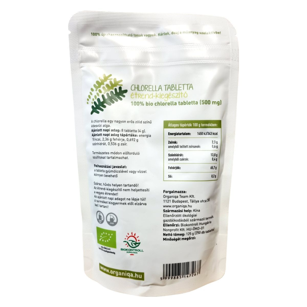 A chlorella tabletta 100% bio minőségben érhető el, és ellenőrzött ökológiai gazdálkodásból származik. A termék 250 db tablettát tartalmaz, melyek 500 mg chlorellát tartalmaznak. A chlorella egy édesvízi alga, amely segíthet a napi tápanyagbevitel kiegészítésében. A termék újrahasznosítható tasakban érkezik, amelyet a műanyag szelektív hulladékgyűjtőbe lehet dobni. A termék származási helye Kína, és a Biokontroll Hungária Nonprofit Kft. ellenőrzi. A chlorella tabletta természetes módon előforduló szulfitokat tartalmazhat, ezért fontos, hogy az ajánlott napi adagot ne lépje túl, és kisgyermekek elől elzárva tartsa.