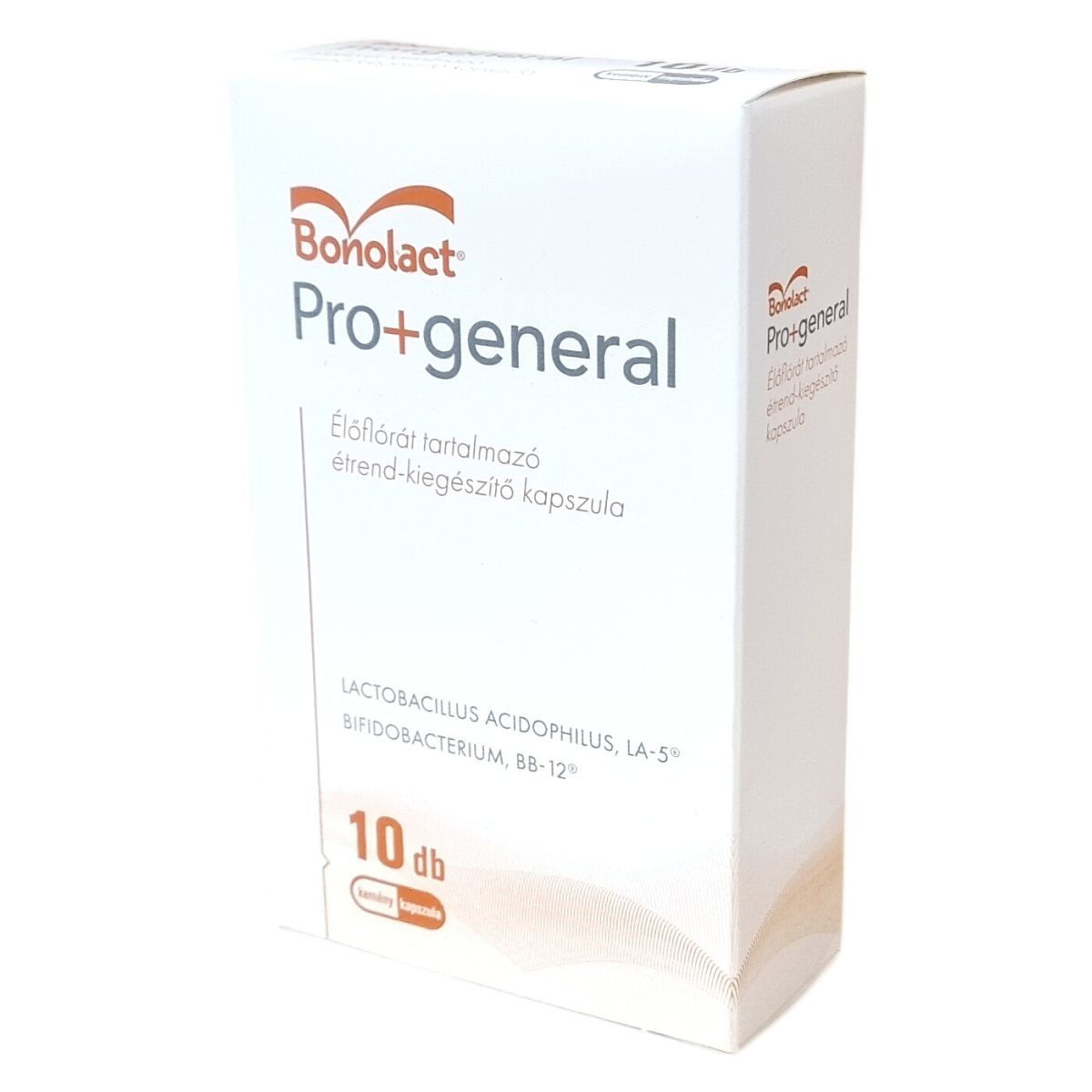 A Bonolact® Pro+general kapszula Lactobacillus acidophilus, LA-5® és Bifidobacterium animalis subsp. lactis, BB-12® aktív baktériumtörzseket tartalmaz, telepképző egységek számában kifejezve. A kapszulát 3 éves kortól ajánlott fogyasztani, napi adagja gyermekeknek egy kapszula, míg 12 éves kortól és felnőtteknek napi két kapszula, étkezés közben, folyadékkal. A kapszula tartalmát felbontás után maximum 37 °C-os folyadékban érdemes feloldani, és közvetlenül fogyasztani. Antibiotikum-kezelés esetén a kapszulát legalább három órával a gyógyszer bevétele után célszerű alkalmazni. A készítmény kapszulaanyagát hidroxipropil-metil-cellulóz alkotja, színezőanyagként kalcium-karbonátot tartalmaz, valamint csomósodást gátló anyagként mikrokristályos cellulóz és magnézium-sztearát található benne. Fontos, hogy az érzékeny személyek ne fogyasszák a terméket, valamint nem ajánlott három év alatti gyermekeknek és immunhiányos állapotban lévőknek. Megfelelő tárolás esetén a termék 25 °C alatt, száraz, fénytől védett helyen őrizhető meg legjobban. A termék LA-5® és BB-12® a Chr. Hansen bejegyzett védjegyei. A bontott csomagolás teljes tartalmát az ajánlott adagolás szerint érdemes felhasználni.