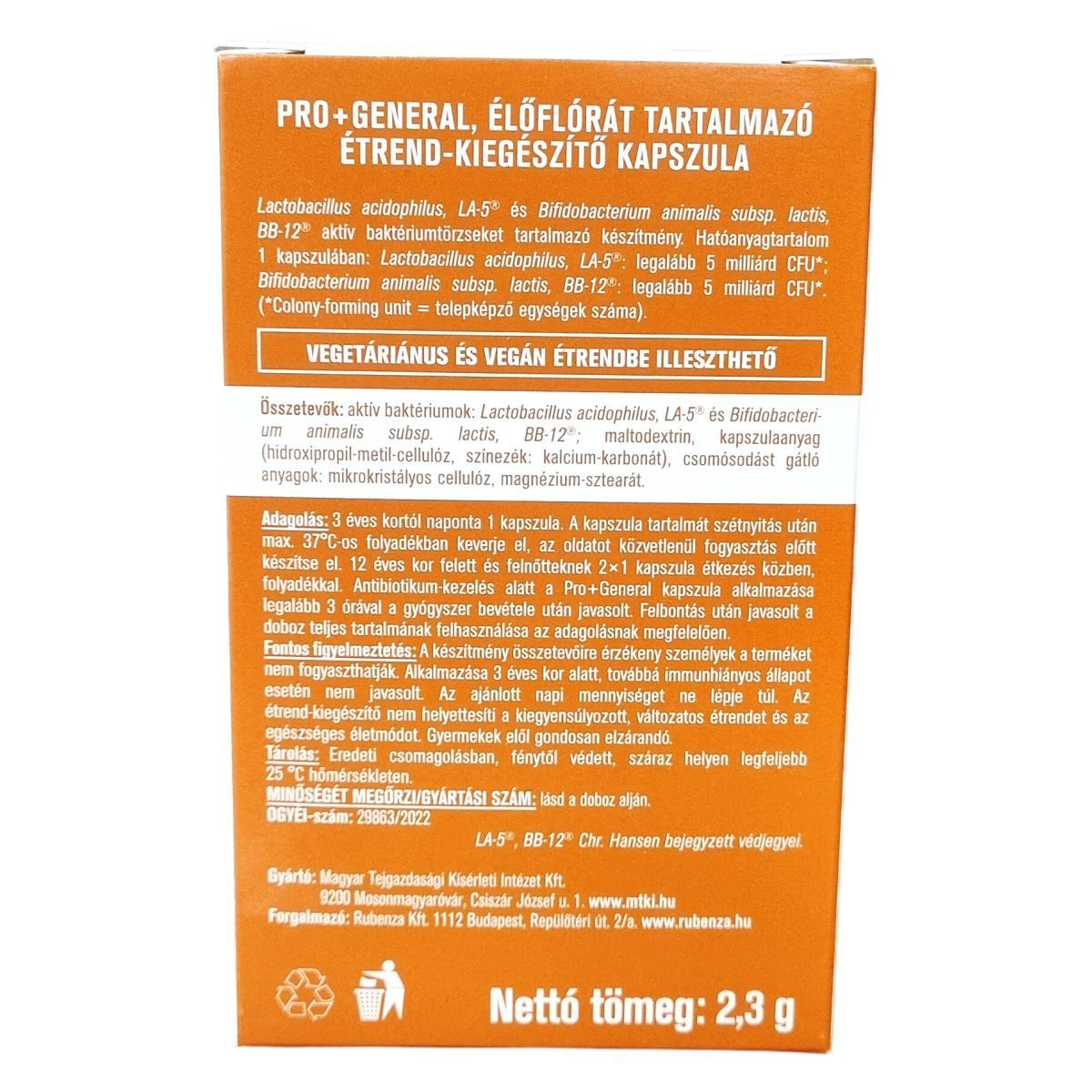 Bifidobacterium animalis subsp. lactis, BB-12®: legalább 5 milliárd CFU.