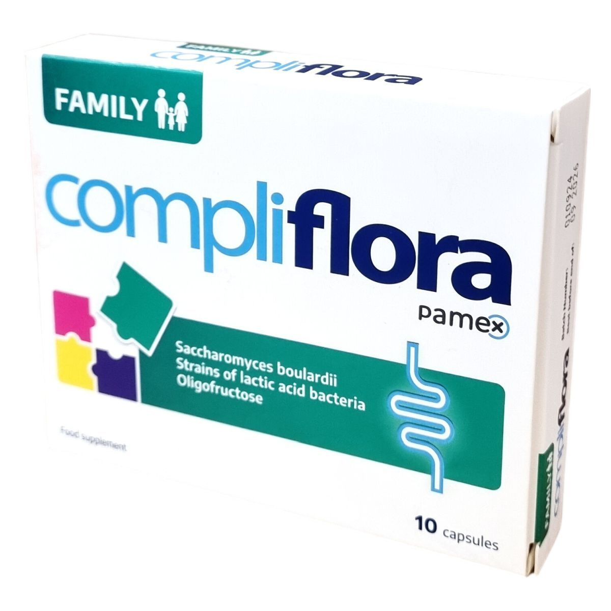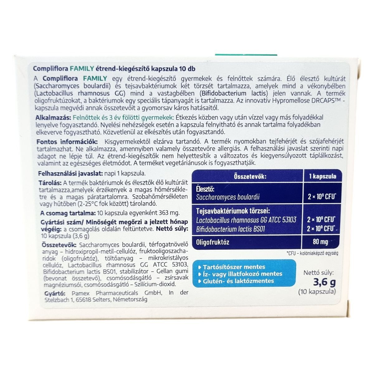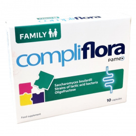 A Compliflora FAMILY kapszula élő Saccharomyces boulardii élesztő-kultúrát, valamint Lactobacillus rhamnosus GG és Bifidobacterium lactis tejsavbaktériumok törzseit tartalmazza, amelyek a vékony- és vastagbélben találhatók. Ezenkívül oligofruktóz prebiotikumot is tartalmaz, amely a baktériumok speciális tápanyagául szolgál. A kapszula különleges Hypromellose DRCAPS bevonattal rendelkezik, mely védelmet nyújt a gyomorsav káros hatásaival szemben. A kapszulát étkezés közben vagy után, folyadékkal ajánlott bevenni; nyelési nehézség esetén a kapszula tartalma folyadékba keverve is fogyasztható, de ilyenkor közvetlenül elkészítés után ajánlott elfogyasztani. Nettó súlya 3,6 g, és 10 kapszulát tartalmaz a csomagolás.