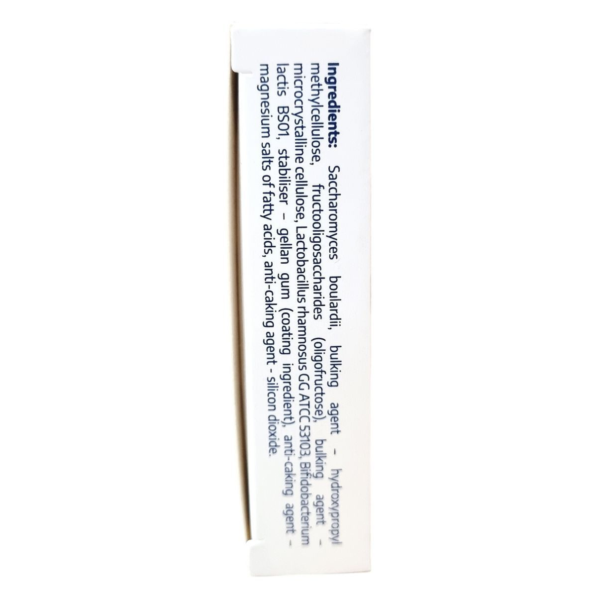 Saccharomyces boulardii, hidroxipropil-metil-cellulóz, oligofruktóz, mikrokristályos cellulóz, Lactobacillus rhamnosus GG ATCC 53103, Bifidobacterium lactis BS01, Gellan gumi, zsírsavak magnéziumsói, szilícium-dioxid