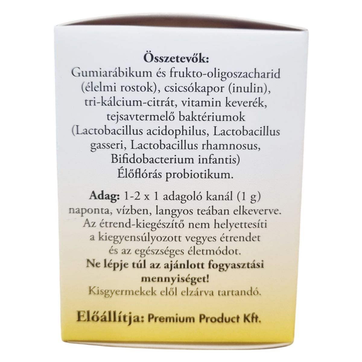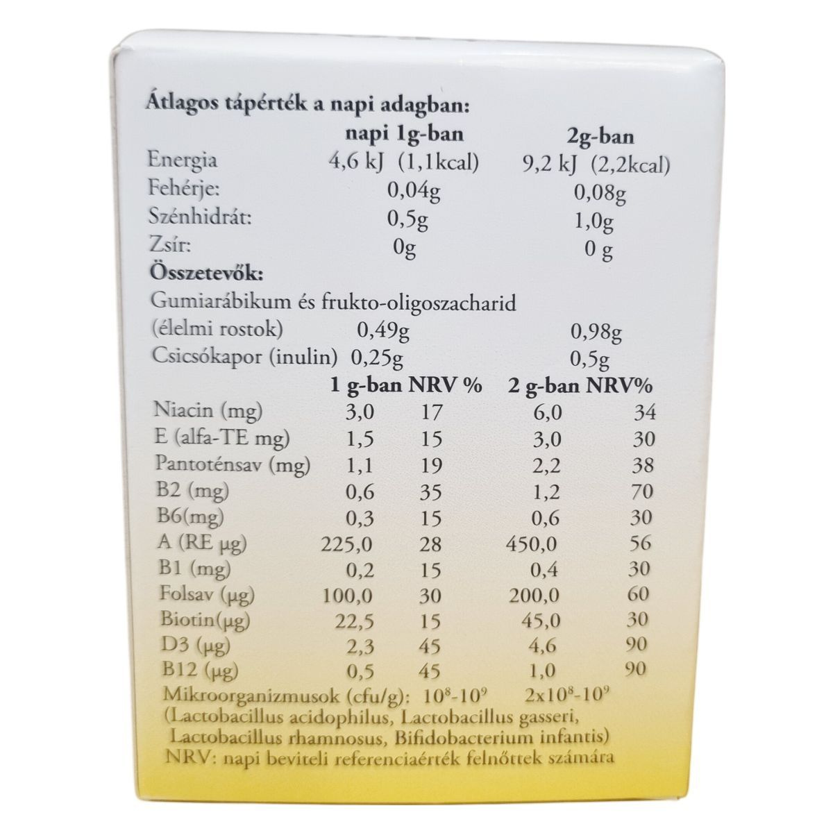 Prebiotikumokat, probiotikumokat és vitaminokat tartalmazó étrend-kiegészítő porkészítmény, amely hozzájárulhat a bélflóra egyensúlyához, az immunrendszer támogatásához és az általános vitalitáshoz.